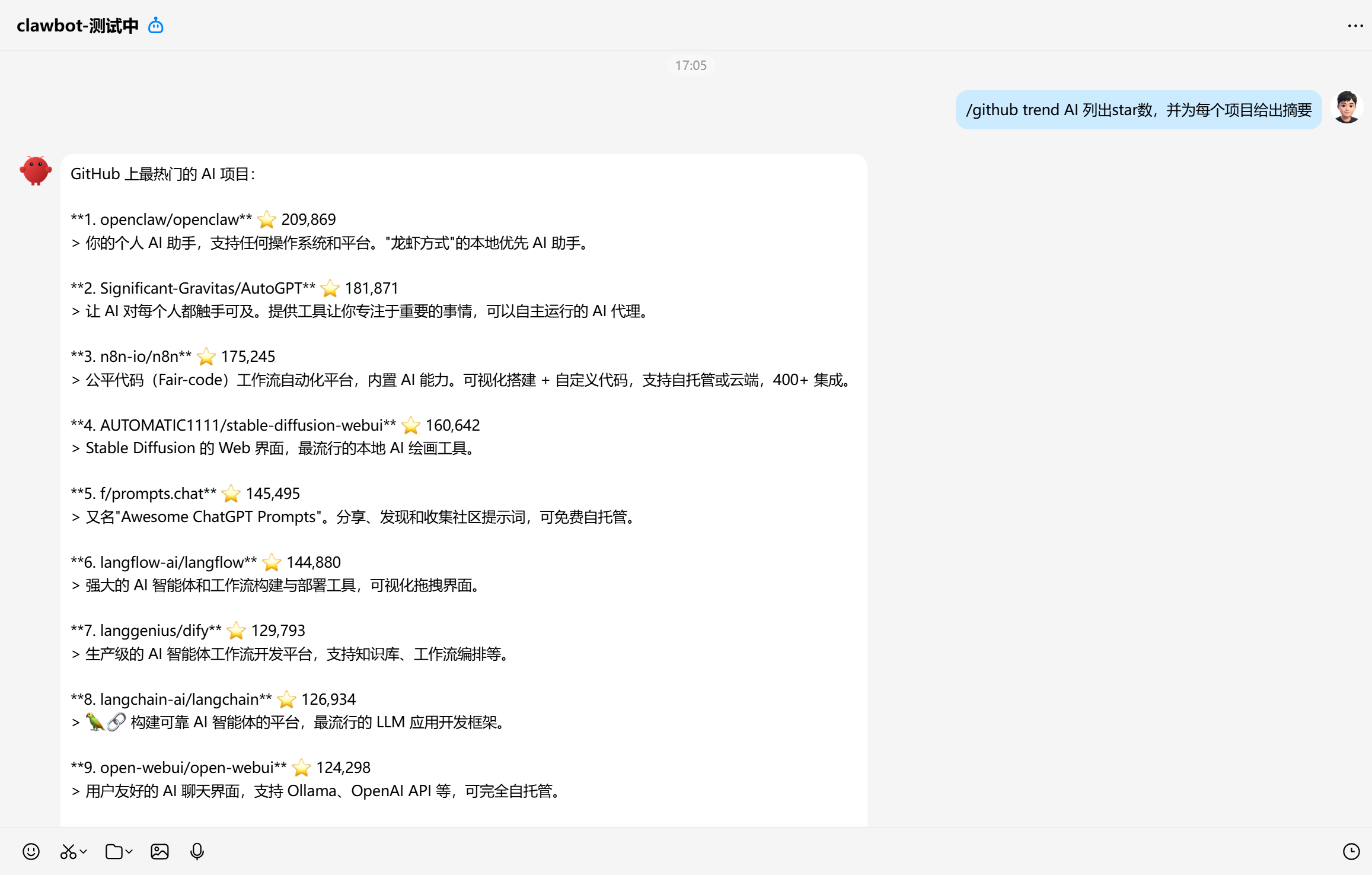 比如我用 /github trend AI列出star数,并为每个项目给出摘要,分析github上star数高的AI项目。clawbot会在后台使用github这个agent skills去完成任务并返回给我。