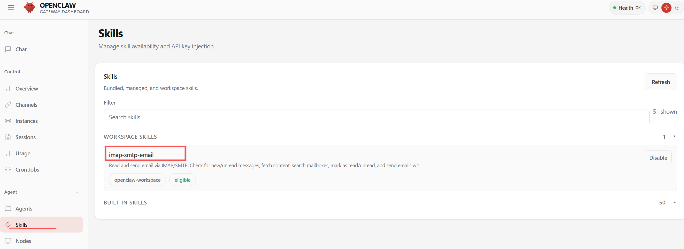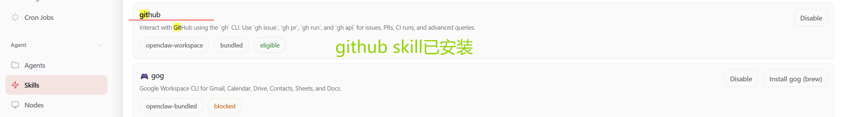 安装Agent skills,后台执行安装命令后到openclaw skills页面查看是否安装成功,如下。