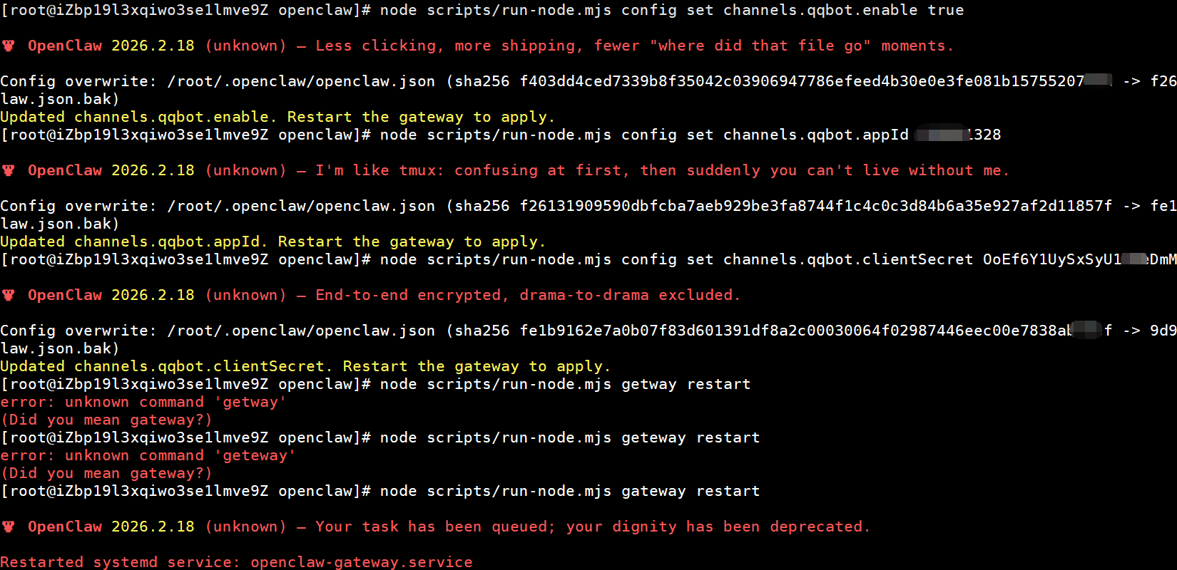 node scripts/run-node.mjs config set channels.qqbot.clientSecret s1BLWht5IVjxBQfvBSj1JbuDXrCXxx
