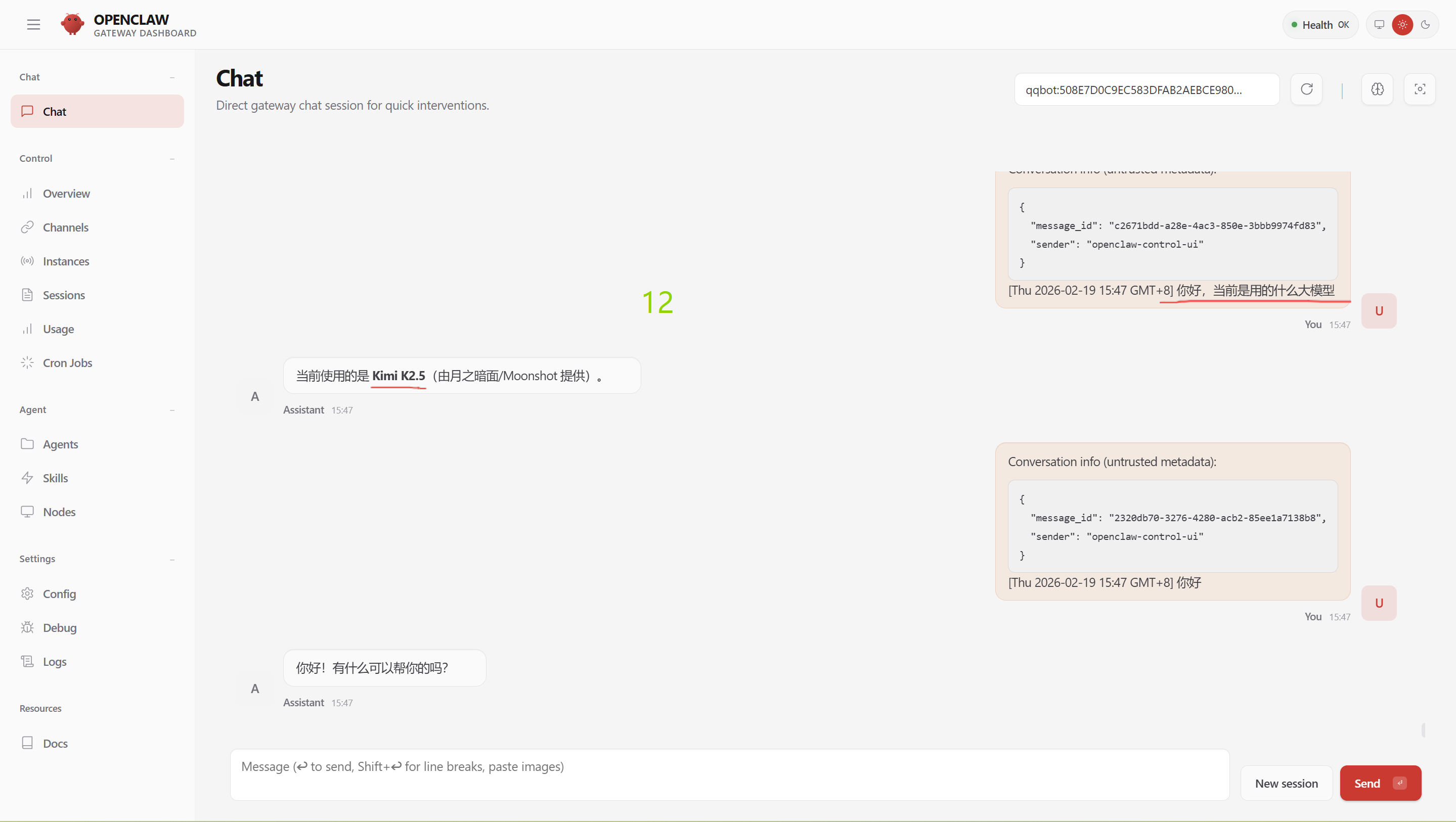 访问openclaw chat http://localhost:18789/chat,在对话chat中输入你好,或者你好,当前是用的什么大模型,如果能正确回复就代表正常了。