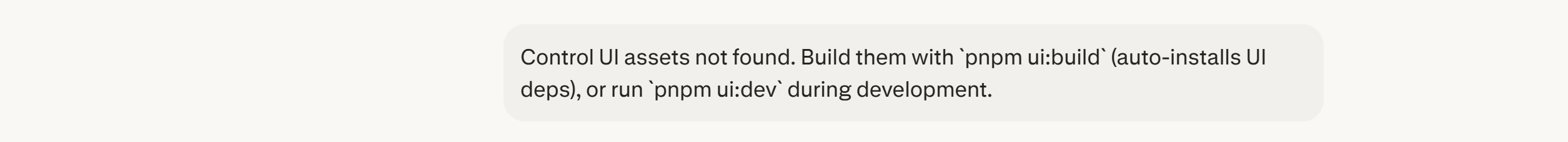 如果访问openclaw chat页面时出现以下错误,在终端执行pnpm ui:build,然后采用token去访问即可 http://localhost:18789/chat?token=3fbd3a540642e2887adfe5560c9848f71ee1d42d3xxxx