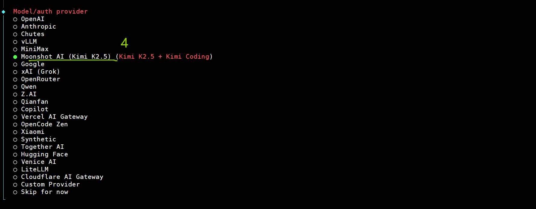 MoonshotAI (月之暗面) 平台 platform.moonshot.cn/console/api… 2.5,我这次用的MoonshotAI,如果要用Qwen或者Anthropic/Google中的gemini大模型上面截图中可以自行去选择即可,Qwen在openclaw中不用提供apikey有试用额度。
