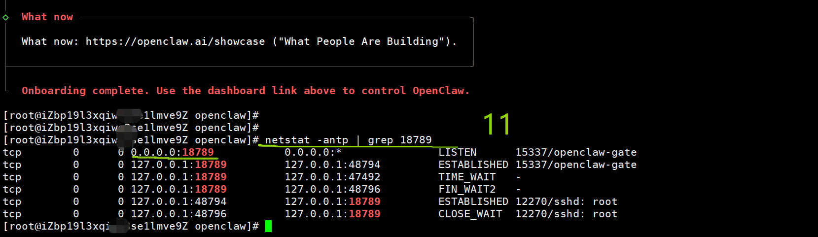 查看gateway端口是否在监听状态,如果在就说明已经部署成功了,如下图4个0代表所有允许远程ip可访问,因为我这次是在云服务器上部署的,要在我的电脑访问,如下的lan就代表允许所有远程ip可访问。