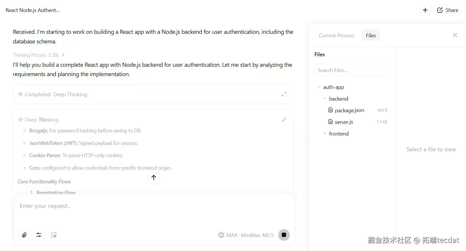 在软件开发场景中,我们测试了模型从零搭建用户认证系统的能力,指令如下: