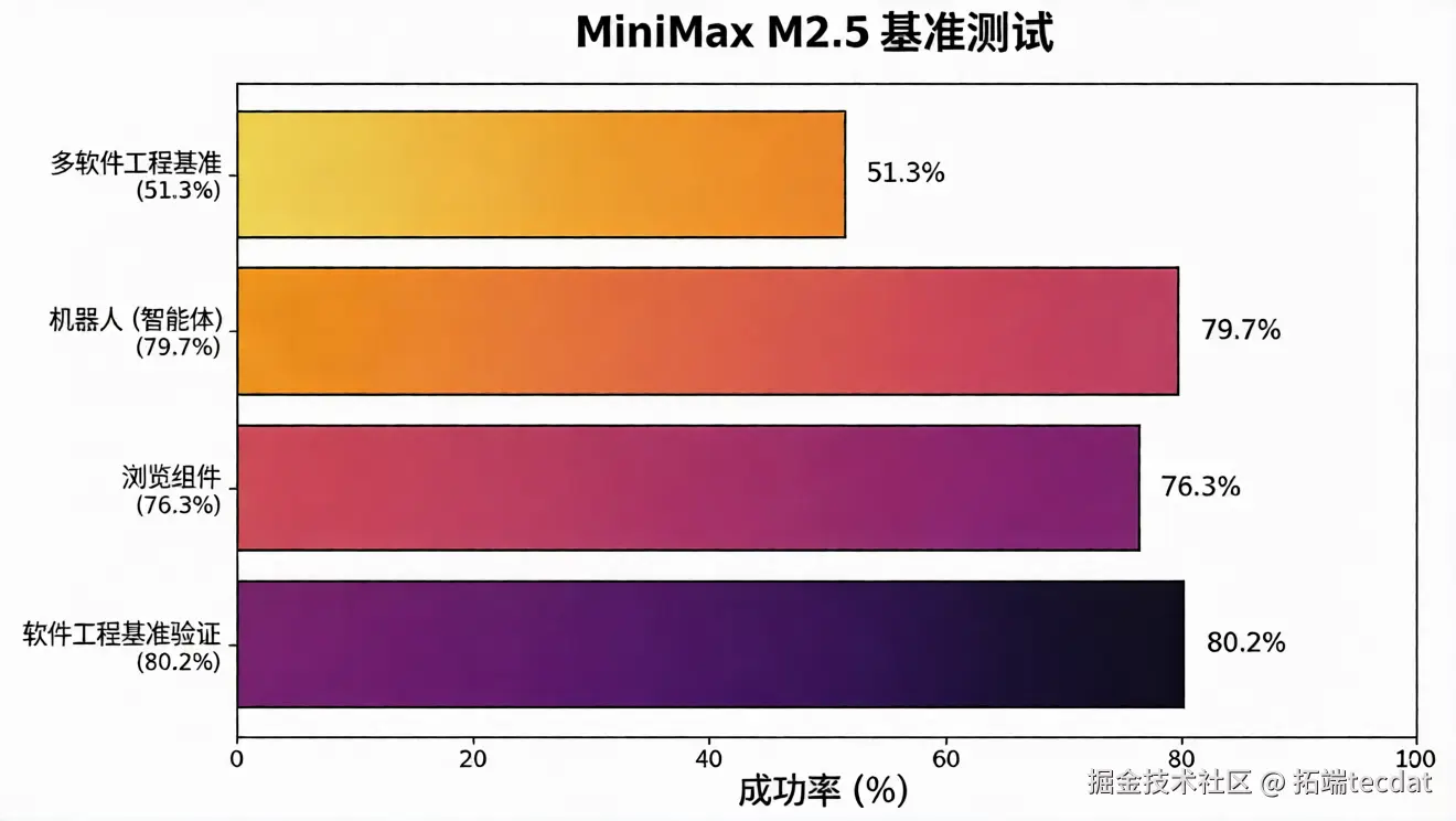 我们通过行业通用的权威基准测试,全面评估了MiniMax M2.5的核心业务性能,测试结果也直观展现了模型的真实实力。