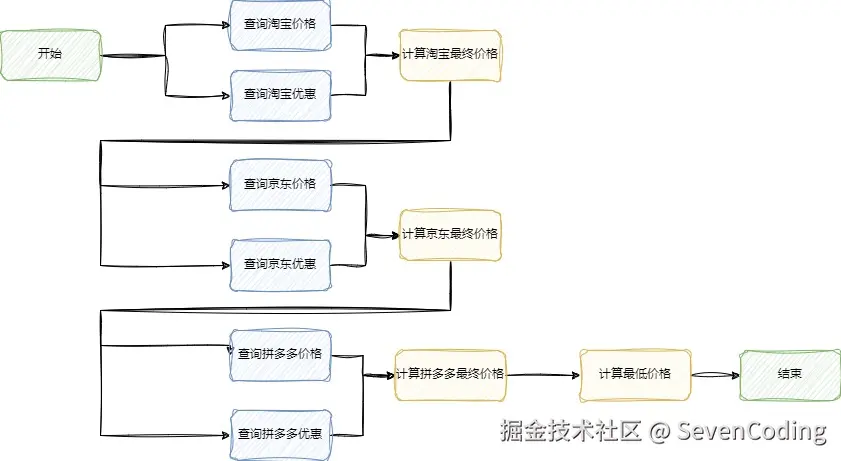 假设现在需求如下: 从网上查询某个产品的最低价格,例如可以从淘宝、京东、拼多多去获取某个商品的价格、优惠金额,并计算出实际的付款金额,最终返回价格最低的价格信息。