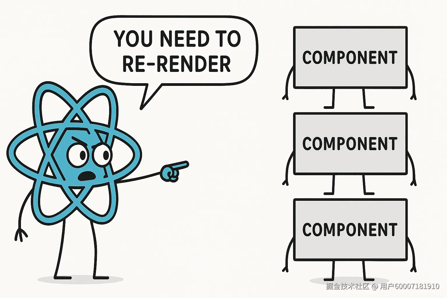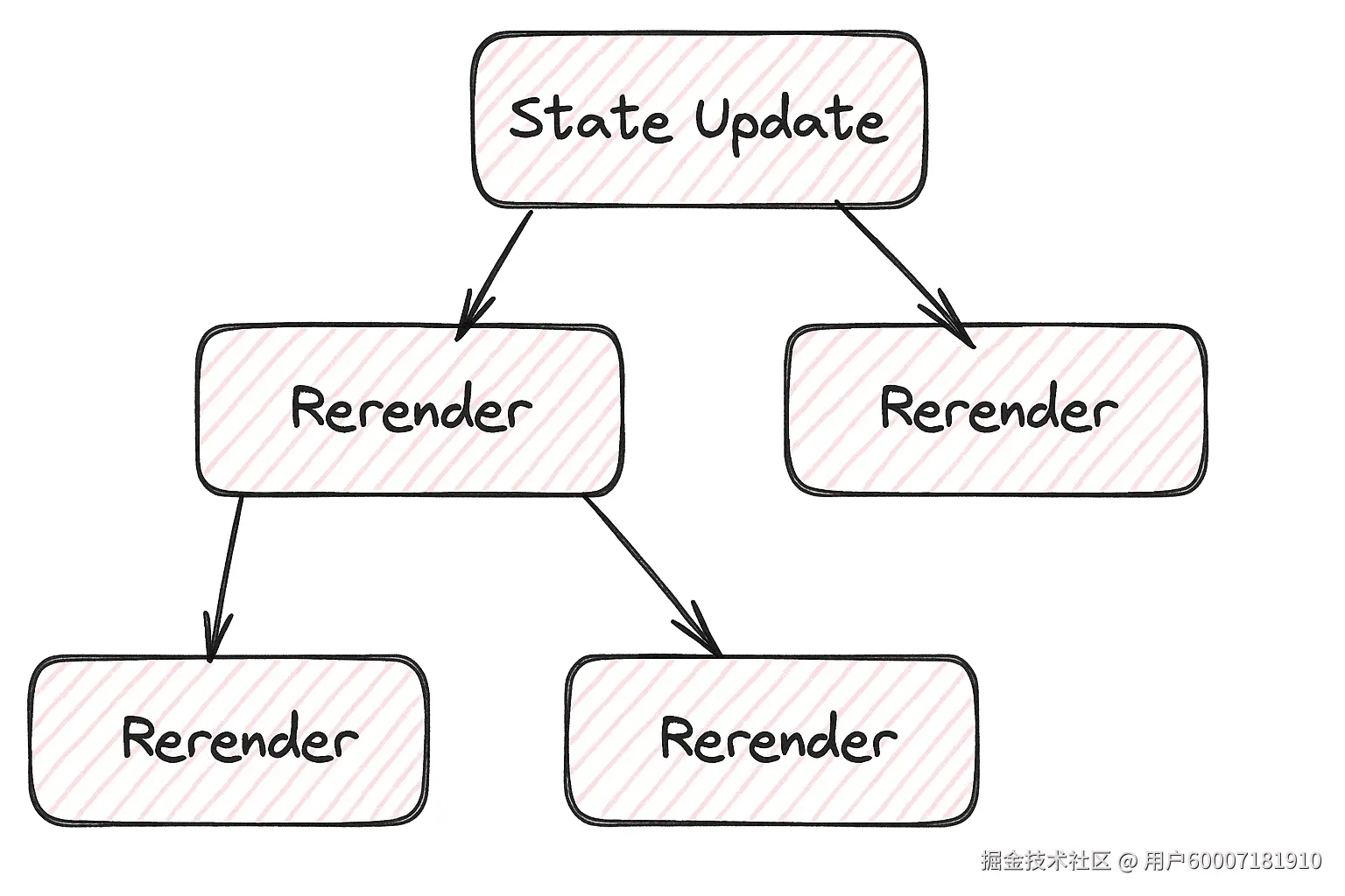 这是理解 React 重渲染的关键,需要牢记的一点是:React 永远不会向上触发重渲染。即便状态更新发生在组件树的中间节点,也只有该节点下方的组件会被重渲染。