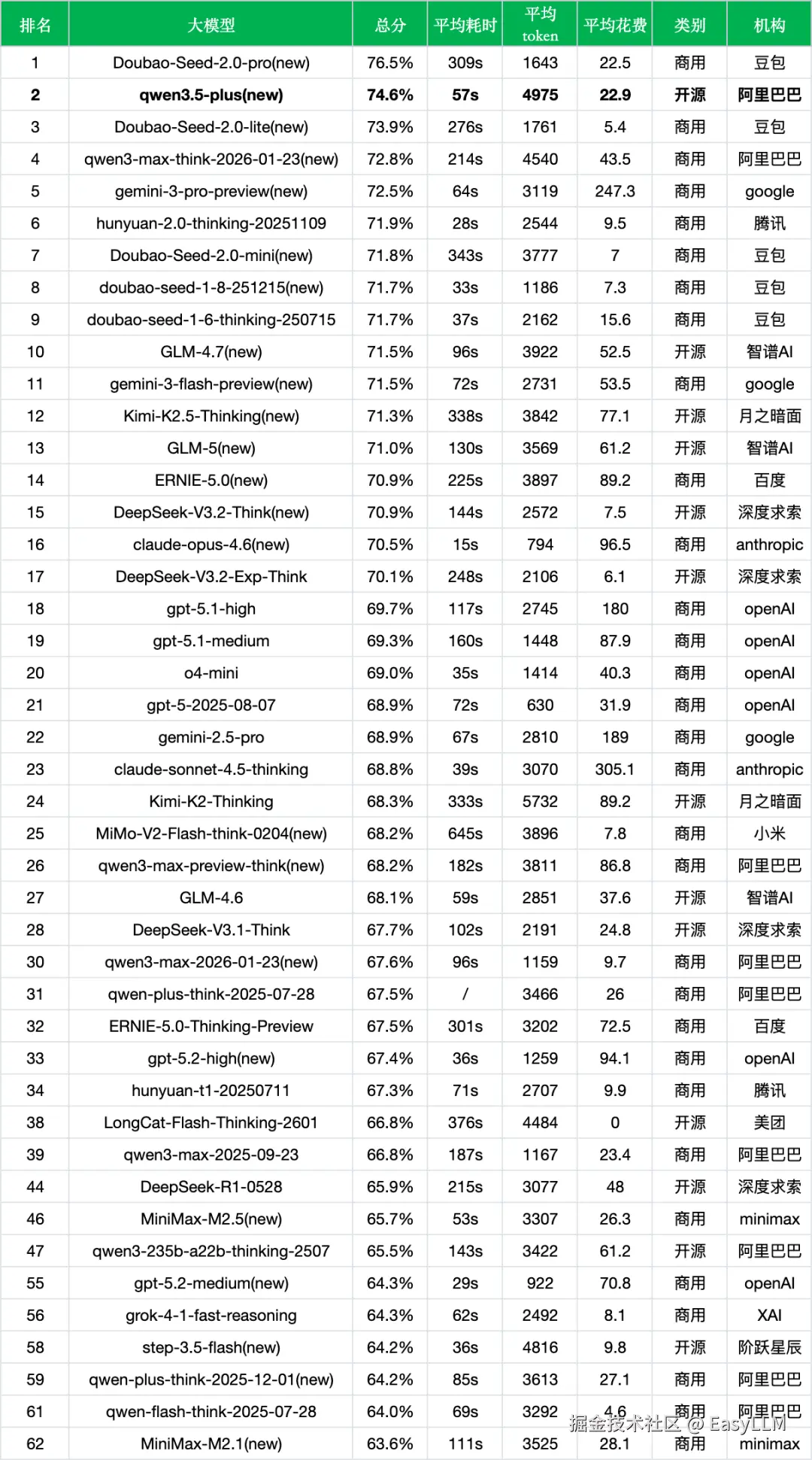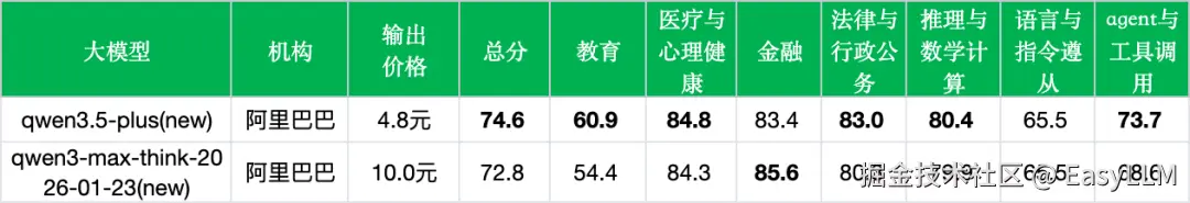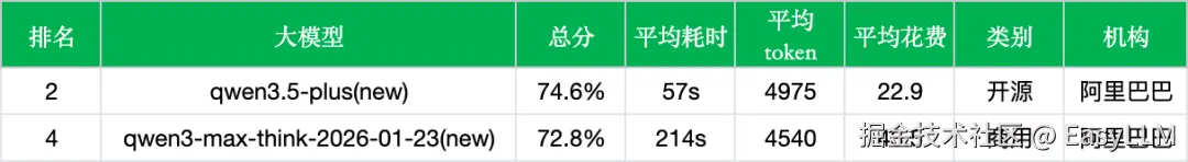 - 阿里产品线内部分化明显:在排行榜中,阿里系模型呈现明显的梯队分布——qwen3.5-plus(74.6%,第2位)领跑,qwen3-max-think-2026-01-23(72.8%,第4位)紧随其后,而qwen3-max-preview-think(68.2%,第26位)、qwen3-max-2026-01-23(67.6%,第30位)、qwen3-235b-a22b-thinking-2507(65.5%,第47位)则分布在中游偏下位置。
