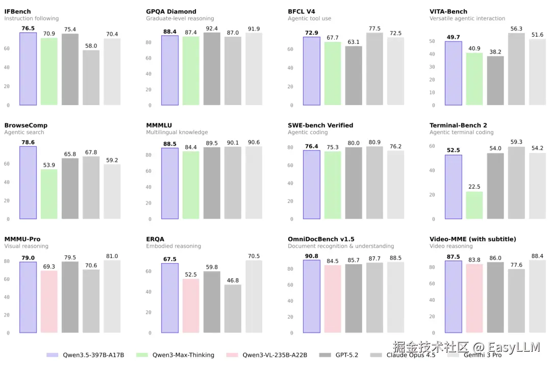 在基础交互与智能体应用层面,Qwen3.5-397B-A17B 表现出显著的优势与差异化特征: