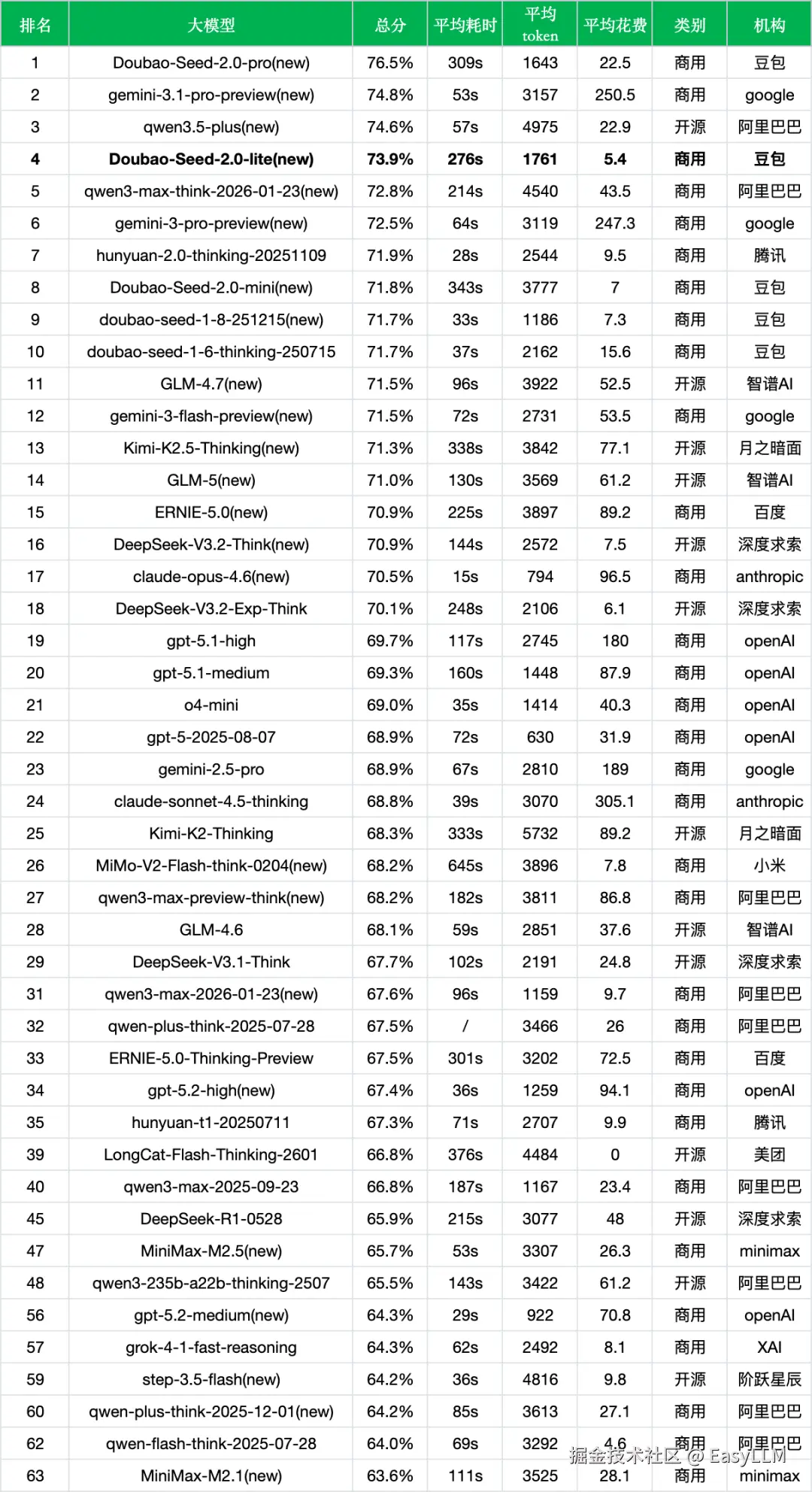 - 豆包家族矩阵成型:数据进一步印证了豆包产品矩阵的完善。从追求极致性能的旗舰级 Doubao-Seed-2.0-pro(76.5%,22.5元),到主打高成本效率比的 Doubao-Seed-2.0-lite(73.9%,5.4元),再到更轻量级的 Doubao-Seed-2.0-mini(71.8%,7.0元),覆盖了不同算力预算与任务复杂度的用户群体。