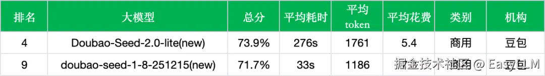 - 整体性能稳步提升:在新一期的评测中,Doubao-Seed-2.0-lite 版本的总分相比doubao-seed-1-8-251215的 71.7%,提升至 73.9%,总排名前进至第 4 位。