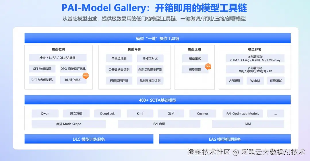 Model Gallery 是阿里云人工智能平台 PAI 的产品组件,它集成了国内外 AI 开源社区中优质的预训练模型,涵盖了 LLM、AIGC、CV、NLP 等各个领域。通过 PAI 对这些模型的适配,用户可以以零代码方式实现从训练到部署再到推理的全过程,简化了模型的开发流程,为开发者和企业用户带来了更快、更高效、更便捷的 AI 开发和应用体验。