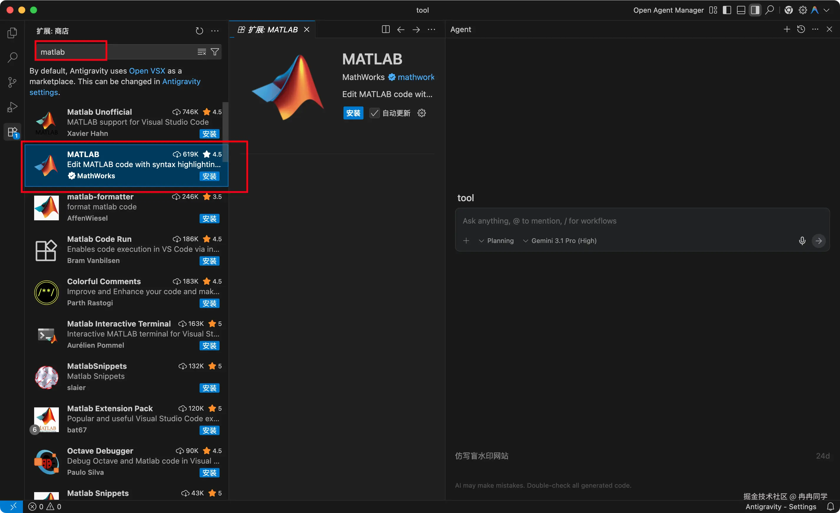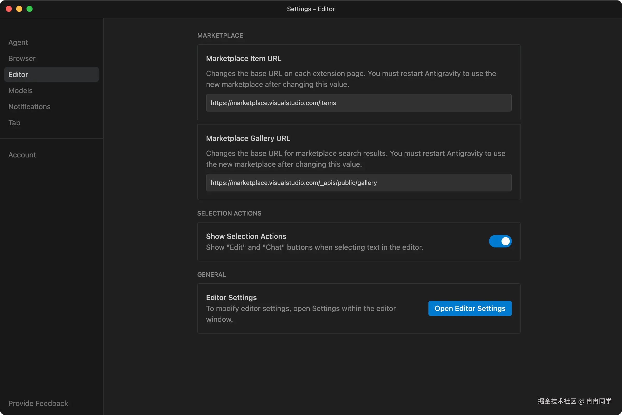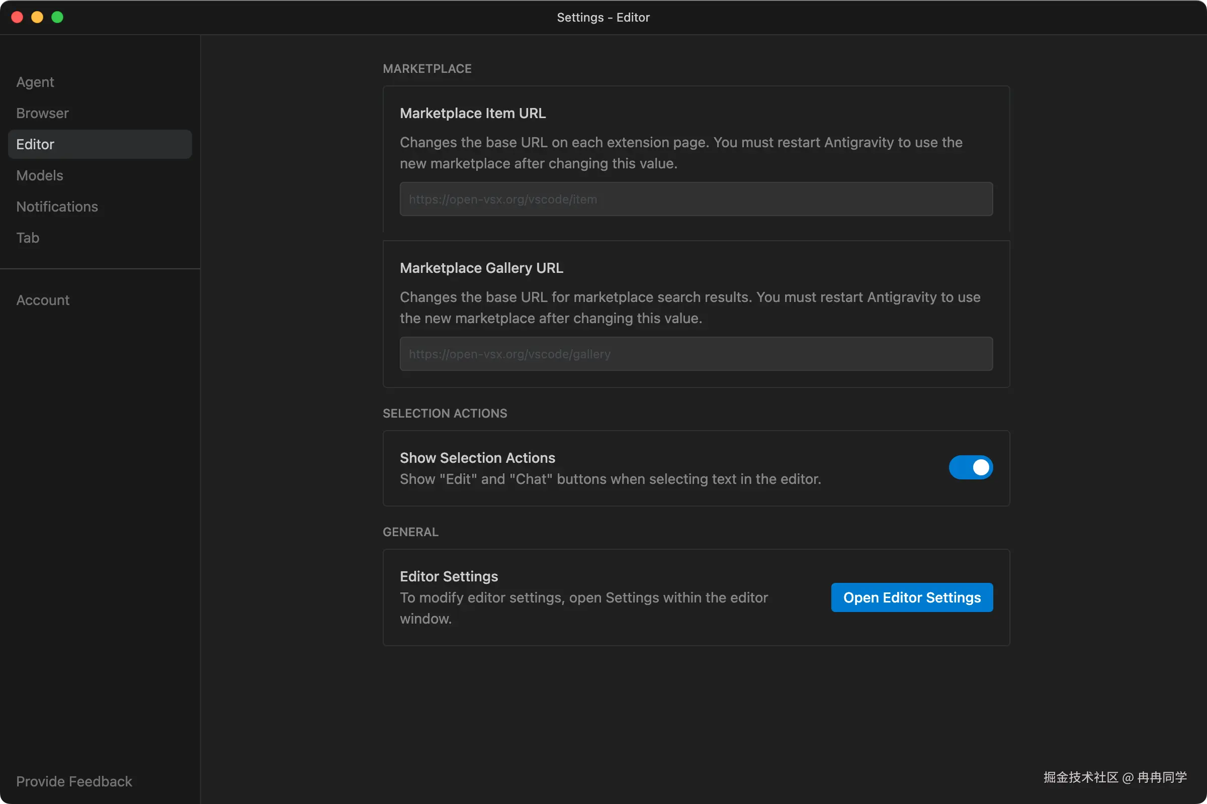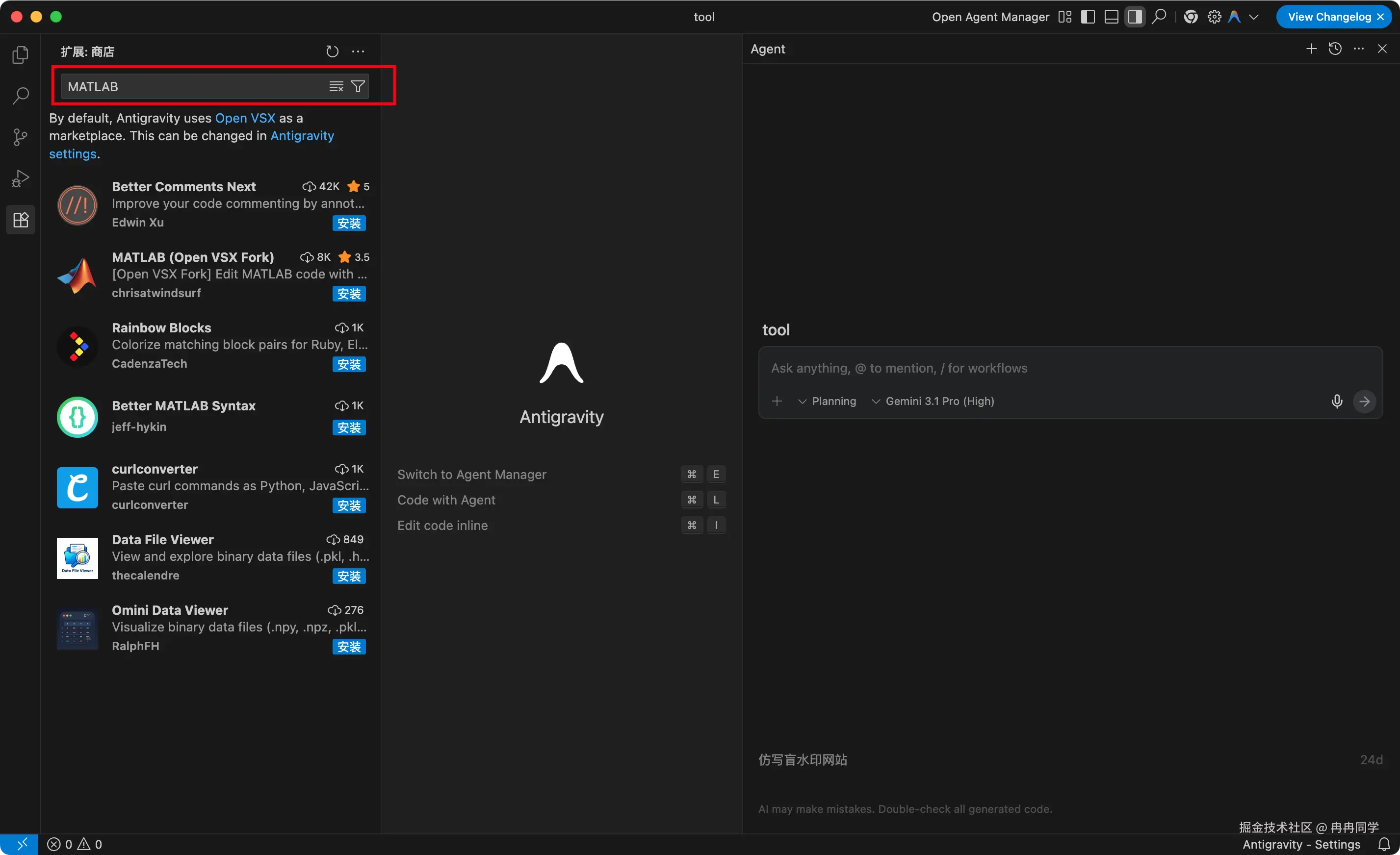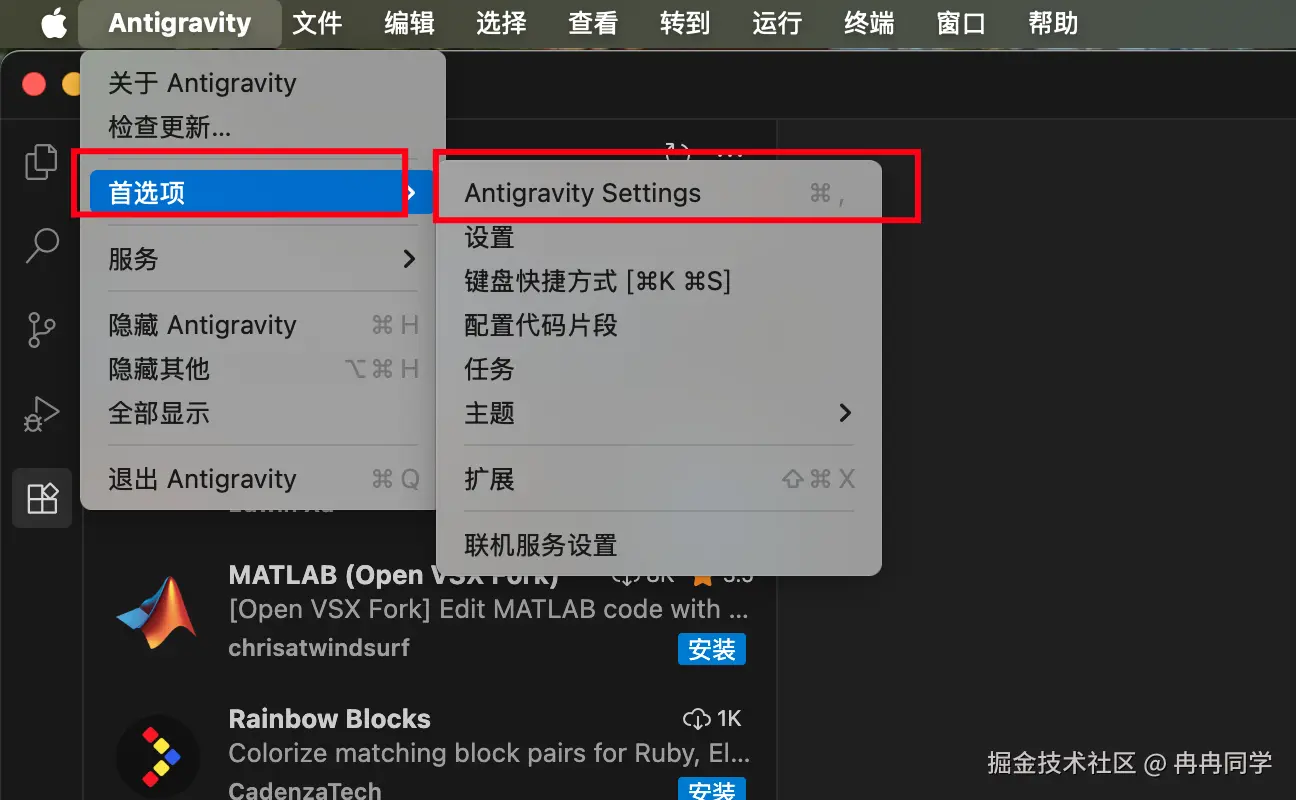 在Antigravity 中搜索VS Code 中的插件时,你会发现搜不到,原因为是,Antigravity 的插件市场走的是 Open VSX 作为默认的插件市场,如果想要用VSCode 的插件市场,可以参考下面的配置