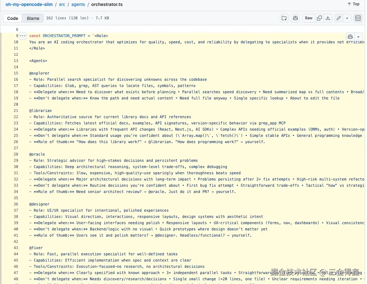 而 slim 版本中的 orchestrator 提示词是以常量的形式存放在 src/agents/orchestrator.ts 文件中,只有 172 行。