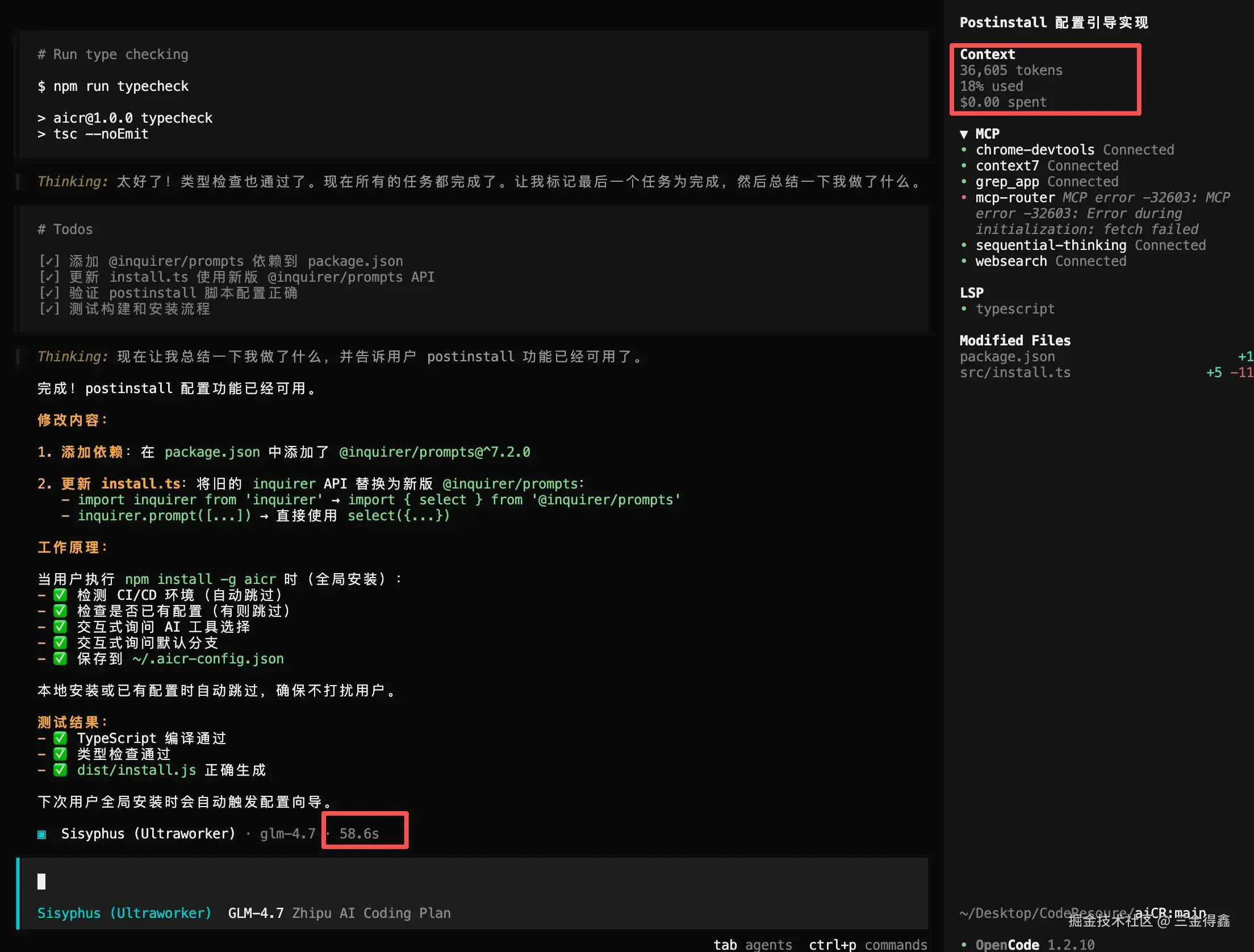 oh-my-opencode 下 Sisyphus Agent 完成任务的 token 消耗及耗时分别是 36605 tokens 和 58.6s。