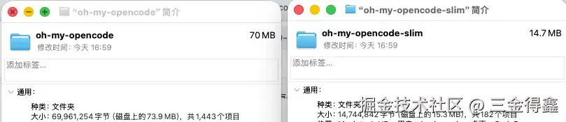 如图,oh-my-opencode-slim 的体积相较于 oh-my-opencode 减少了 80% ,文件数减少了 87%!