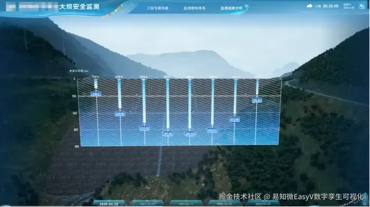 针对上述痛点,易知微结合工程特色利用EasyModel数字空间底座生产平台构建了该西南地区大型水电枢纽的数字孪生工程模型,通过动态渲染技术,立体化呈现变形、渗流渗压、应力应变及温度等核心指标。深度融合安全监测与运行管理系统,精准展示坝体毫米级位移轨迹、浸润线空间分布、内部应力场传导与温度场演变全过程,支持多时段数据对比与特定坝段聚焦分析,为工程运行性态诊断与风险预警提供了高透明度、多维度的数字决策支撑。初步实现大坝安全监测数据的自动采集、整理整编与专业分析,提升大坝的安全管理水平与在线监控能力,为该水电站的安全稳定运行提供了数据支撑。