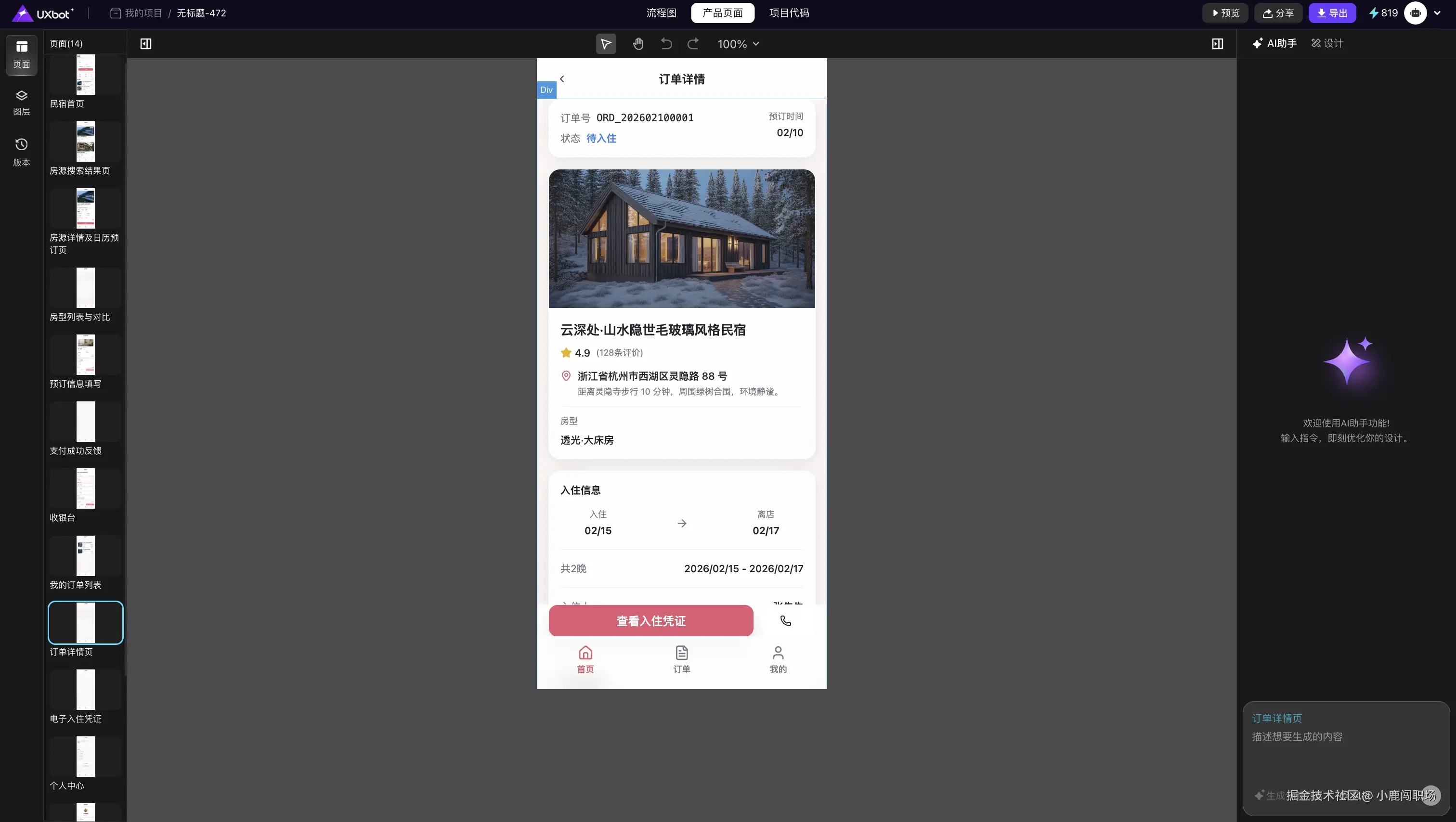 举个例子就很清楚:你想做一套民宿手机端的多页面预订项目,只要输入:“民宿移动端预订页,要有日历、价格显示、房型列表、预订按钮,毛玻璃风格”。UXbot 就能自动读懂你的需求,梳理好完整的用户流程,一次性生成整套高保真页面,还能立刻做出可点击交互的演示原型。关键是,它能一键生成 iOS(Swift)、Android(Kotlin)原生代码和 Web 端 Vue.js 代码,代码拿来就能用,还能云端一键部署、编译成 APK 装到手机里实测,大大加快产品验证的速度。