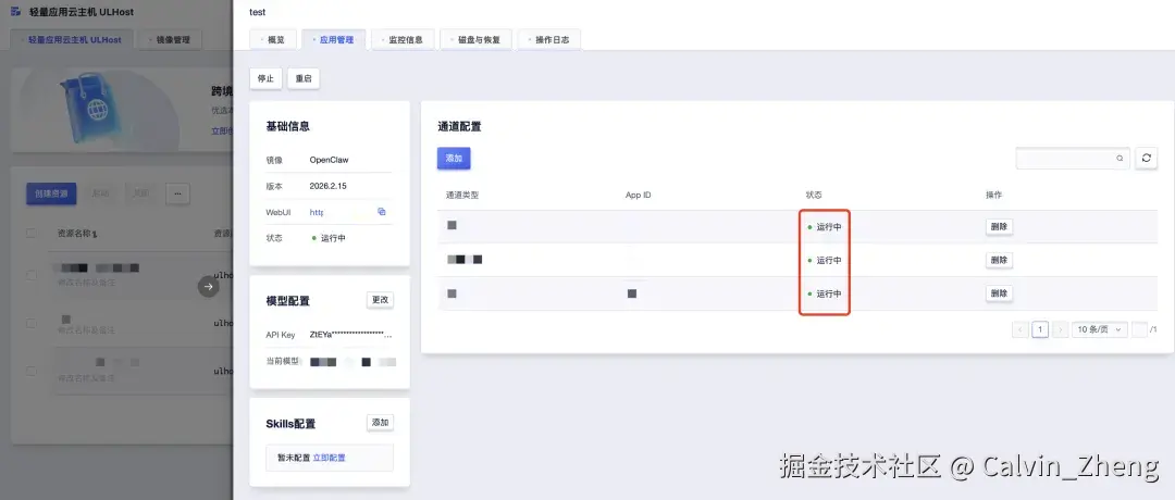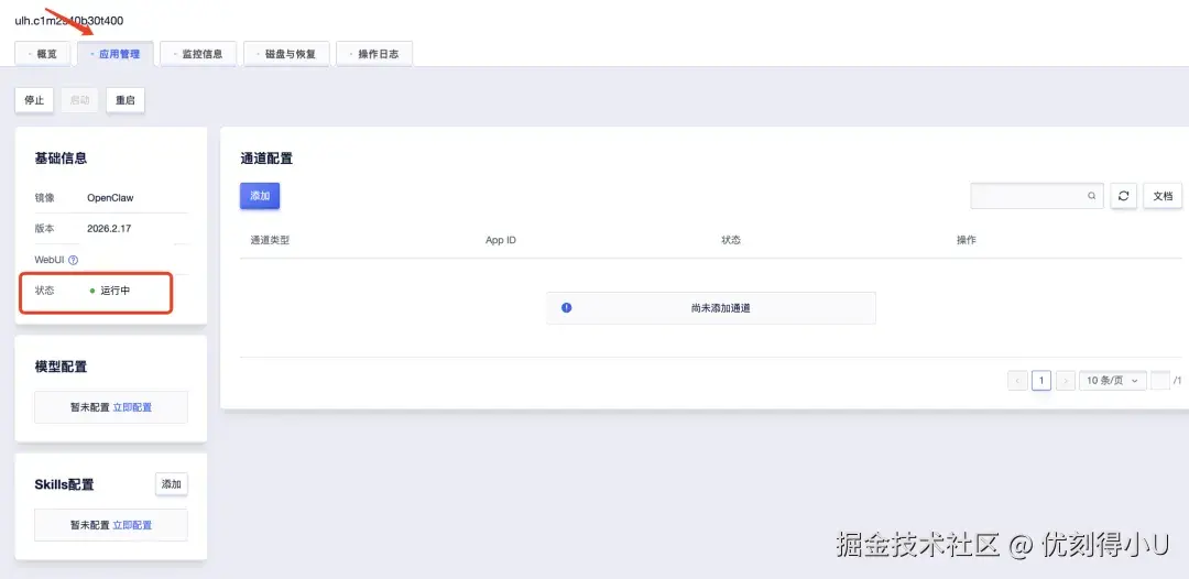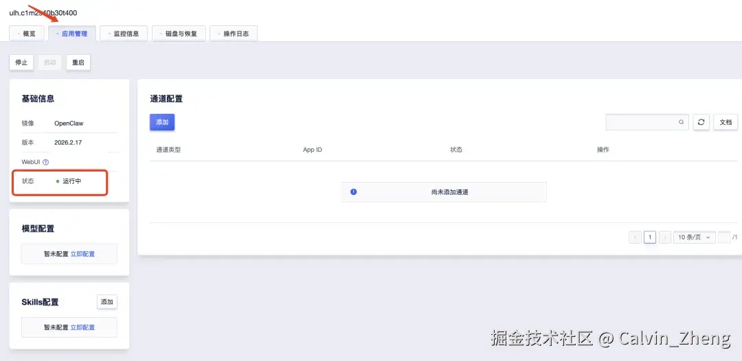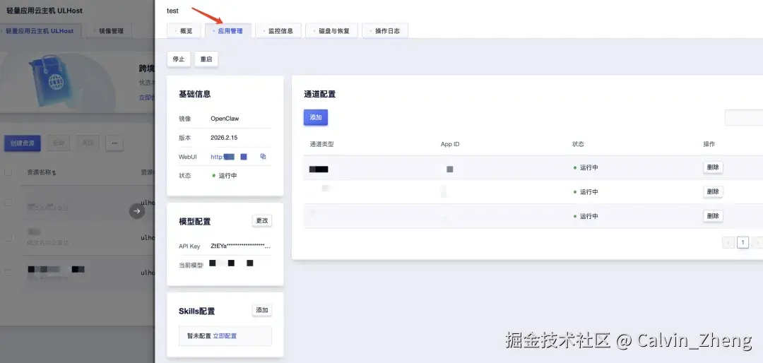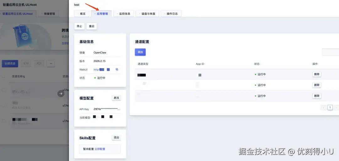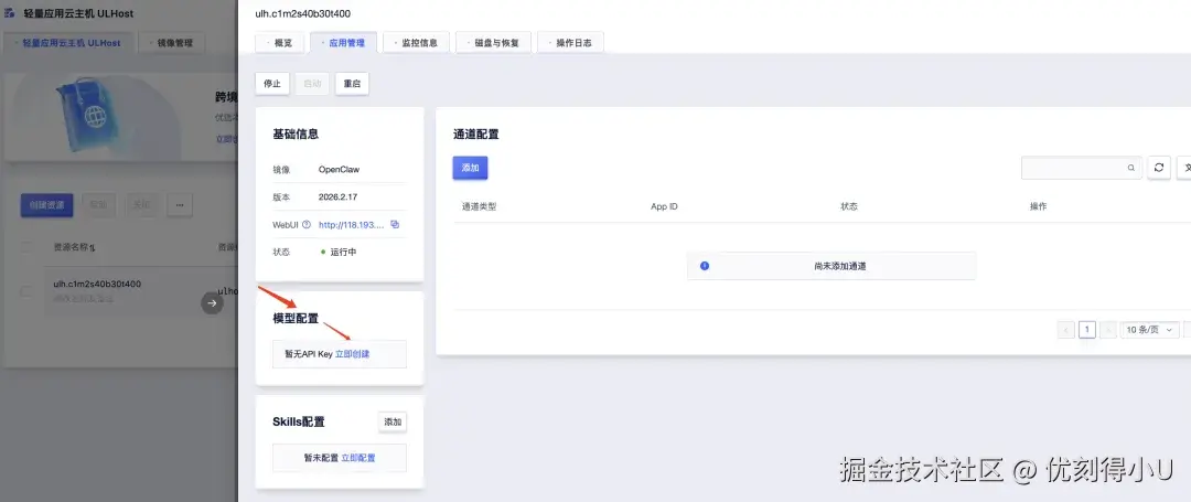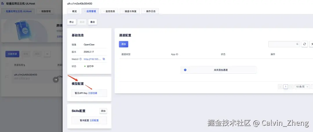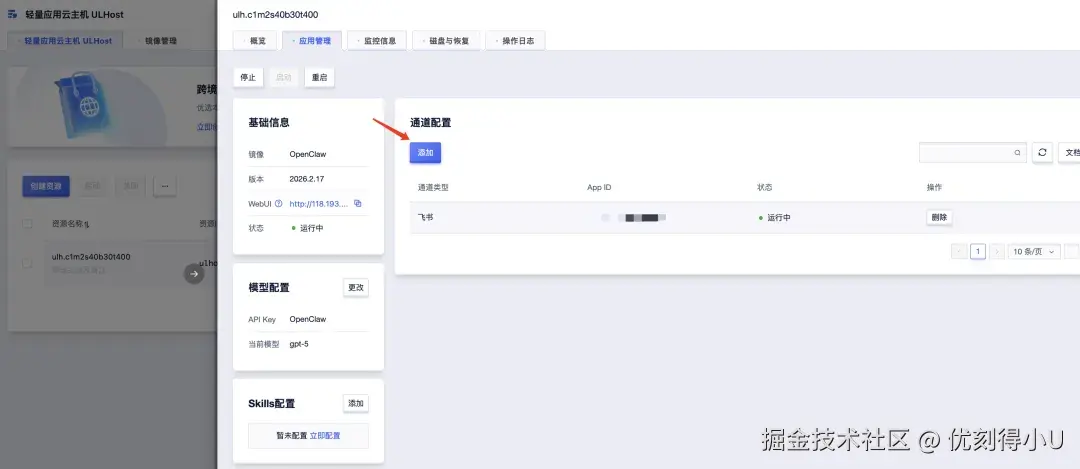 选择相应的轻量应用云主机并进入详情页,点击应用管理即可对AI Agent进行配置。