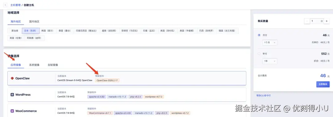 首先创建一台优刻得轻量应用云主机,选择OpenClaw应用镜像。