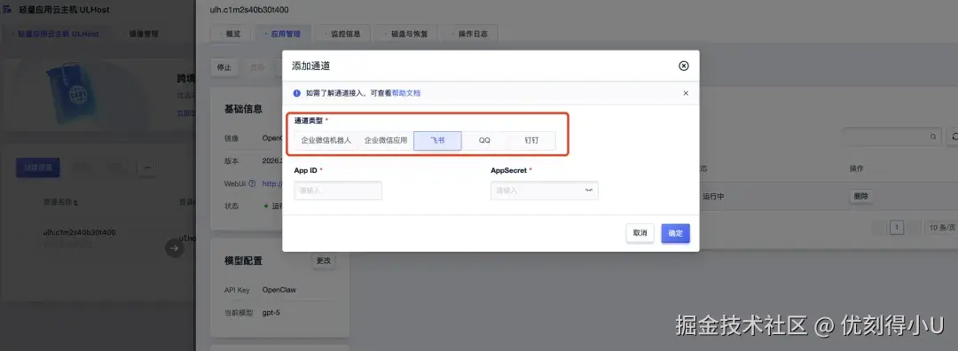 在应用管理页面,找到通道配置,控制台目前已支持接入飞书、QQ、钉钉、企业微信机器人、企业微信应用。点击选择需要添加的通道,填写该通道需要配置的参数并点击完成确认