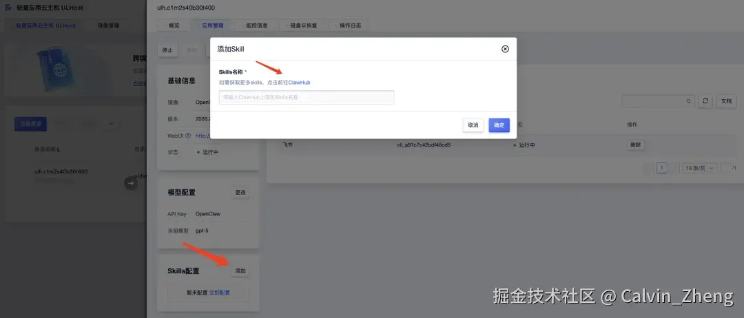 在应用管理页面,找到Skills配置,优刻得轻量应用云主机控制台支持添加已发布到ClawHub的Skills。点击添加按钮,输入Skills的名称即可在控制台完成Skills添加。