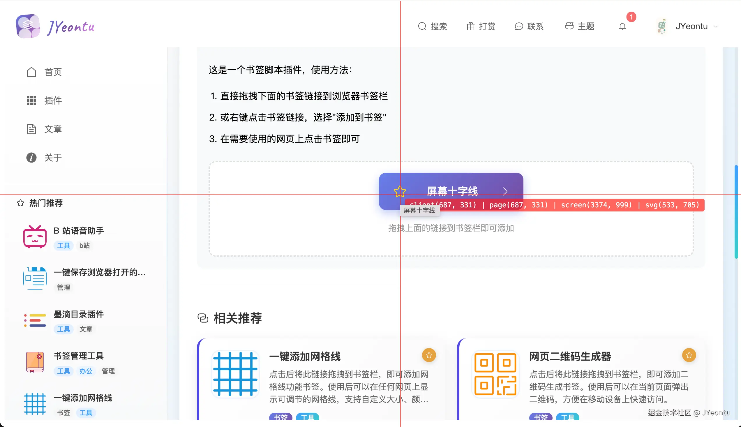 最后干脆自己写了个书签小插件,点一下就能在页面上可视化显示鼠标定位和十字辅助线,坐标在哪、元素对不对齐,一眼就看明白,开发调试瞬间方便多了。