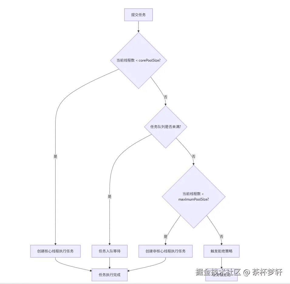 ThreadPoolExecutor 的任务处理遵循以下四步决策链: