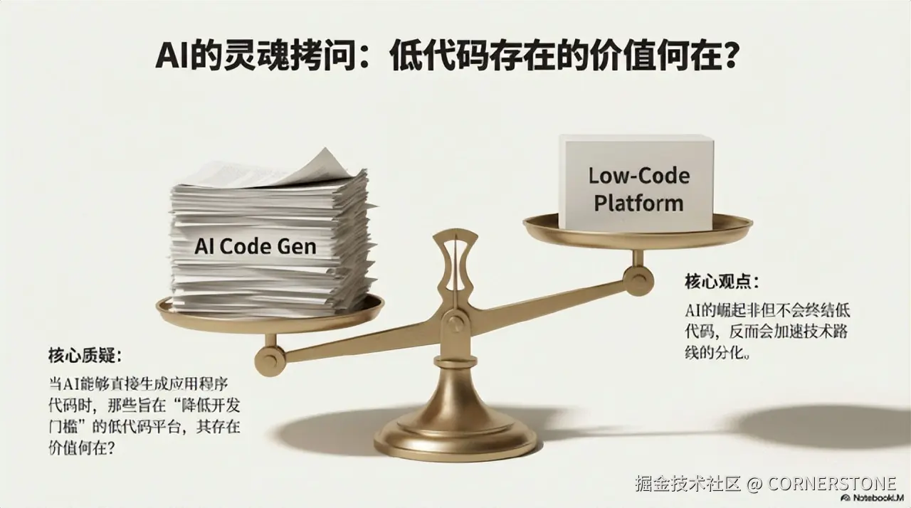 以大语言模型(LLM)为代表的AI,其能力正从处理自然语言扩展到理解甚至生成复杂的结构化业务逻辑。这引发了一个根本追问:当AI能够直接生成应用程序代码时,那些旨在“降低开发门槛”的低代码平台,其存在价值何在?