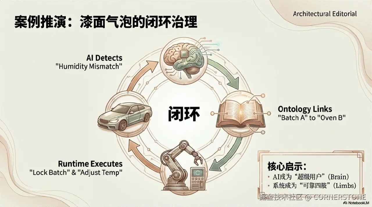 在漆面气泡的案例中,闭环得以形成:AI基于语义层理解事件全貌,分析根因(如“特定涂料批次与当前湿度参数不匹配”),并通过执行引擎直接下发指令(“锁定该批次涂料”、“微调烘干炉参数”)。AI成为系统的“超级用户”,而系统则成为AI可靠、可信的“四肢”。