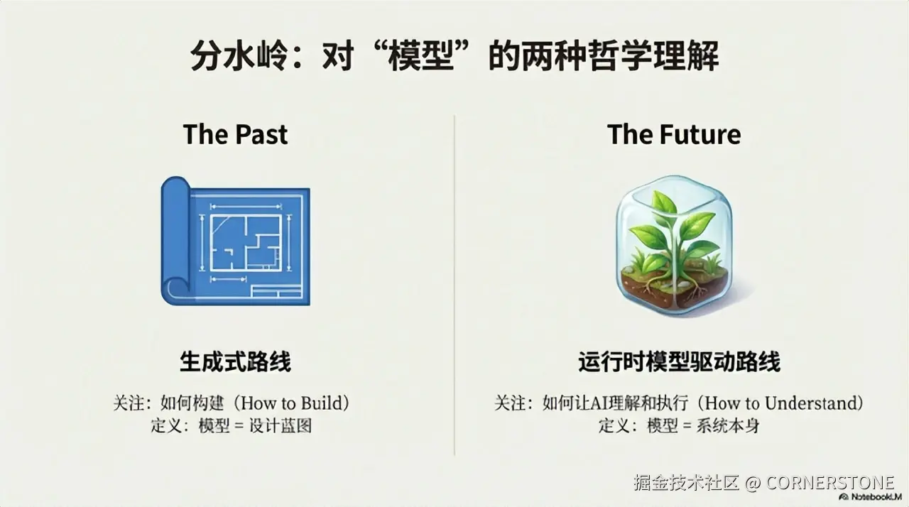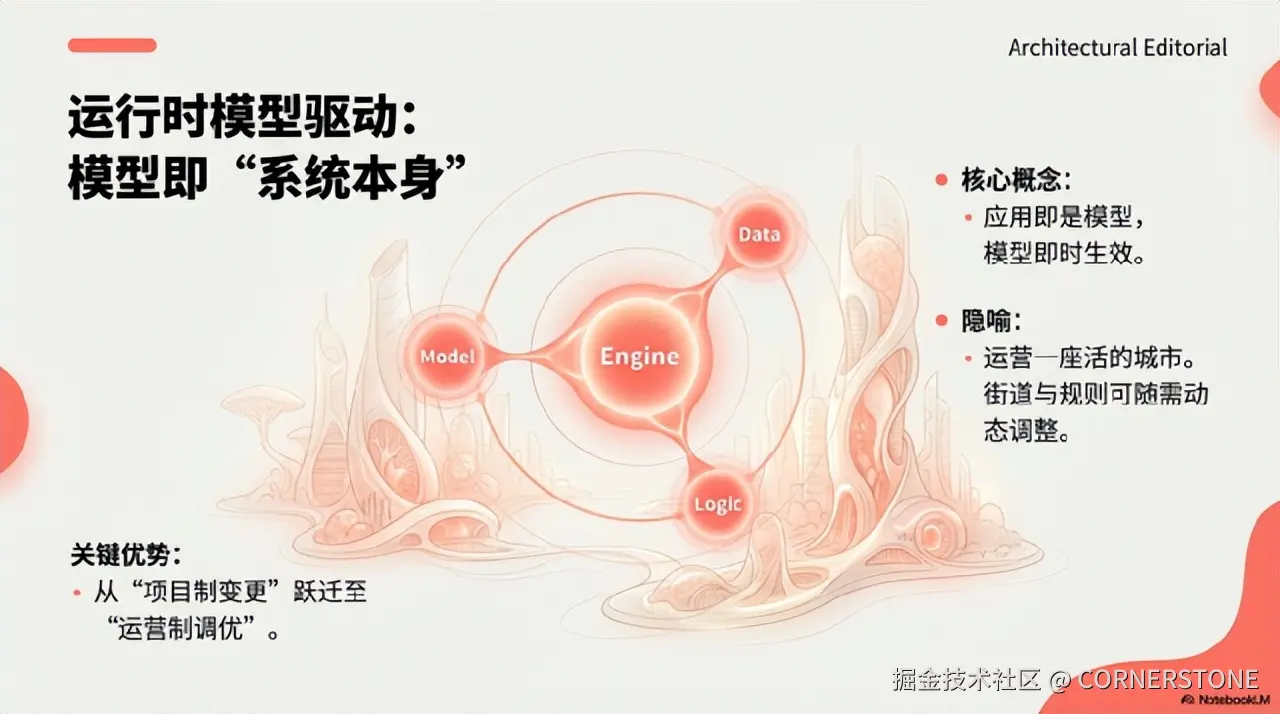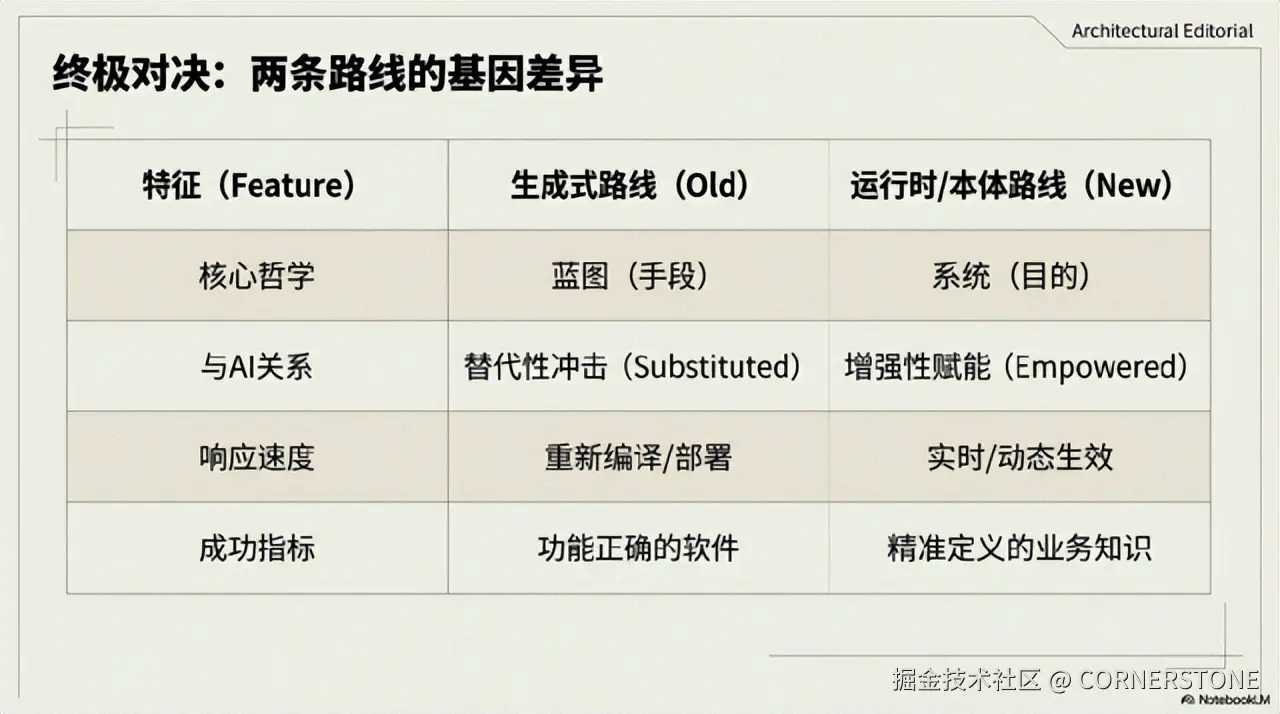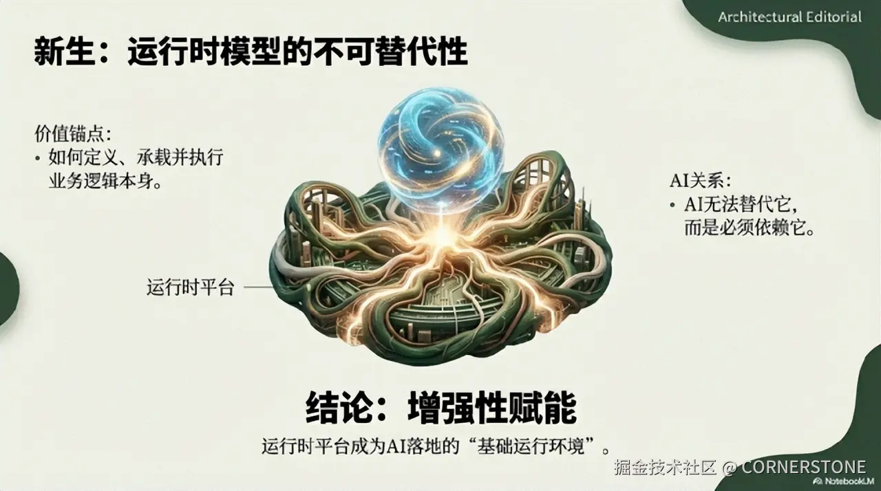 当生成式路线忙于“更快地造房子”时,运行时路线在构建一座**“活的城市”**,其街道、法规和建筑可以随时根据需求动态调整。这一根本区别,在AI时代被无限放大。