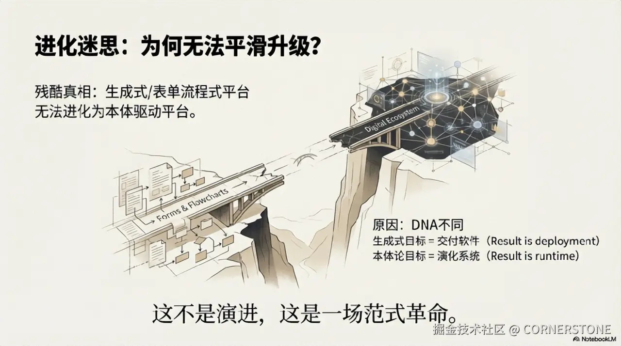 生成式低代码平台,简单表单/流程的低代码平台,无法通过升级或转型成为真正的基于本体驱动的运行时模型平台。核心原因在于它们从哲学根基、技术架构和商业目标上就是两种不同的物种。