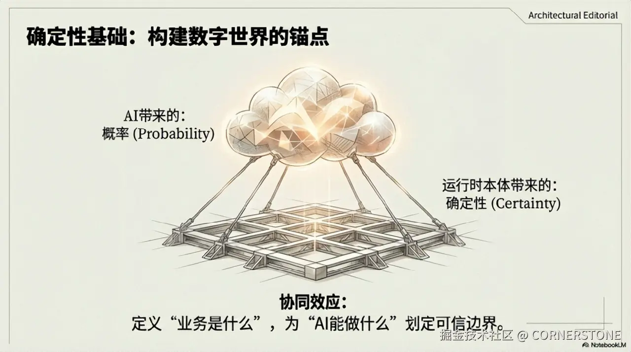 通用智能需要一个由领域知识定义的、结构化的“确定性基础”作为锚点。运行时路线,尤其是其以“本体论”为内核的形态,通过构建一个动态、语义化、可执行的业务模型层,提供了这一不可替代的确定性基础——它定义了“业务是什么”,并为“AI能做什么”划定了清晰、可信的边界。