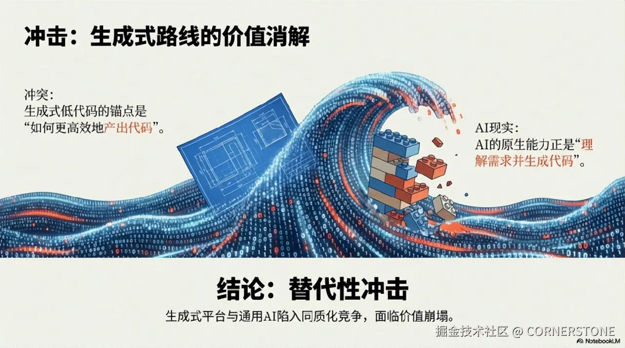 生成式低代码的锚点是“如何更高效地产出代码” 。以大语言模型为代表的AI,其原生能力正是“理解需求并生成代码”,AI对生成式低代码是 “替代性冲击” 。