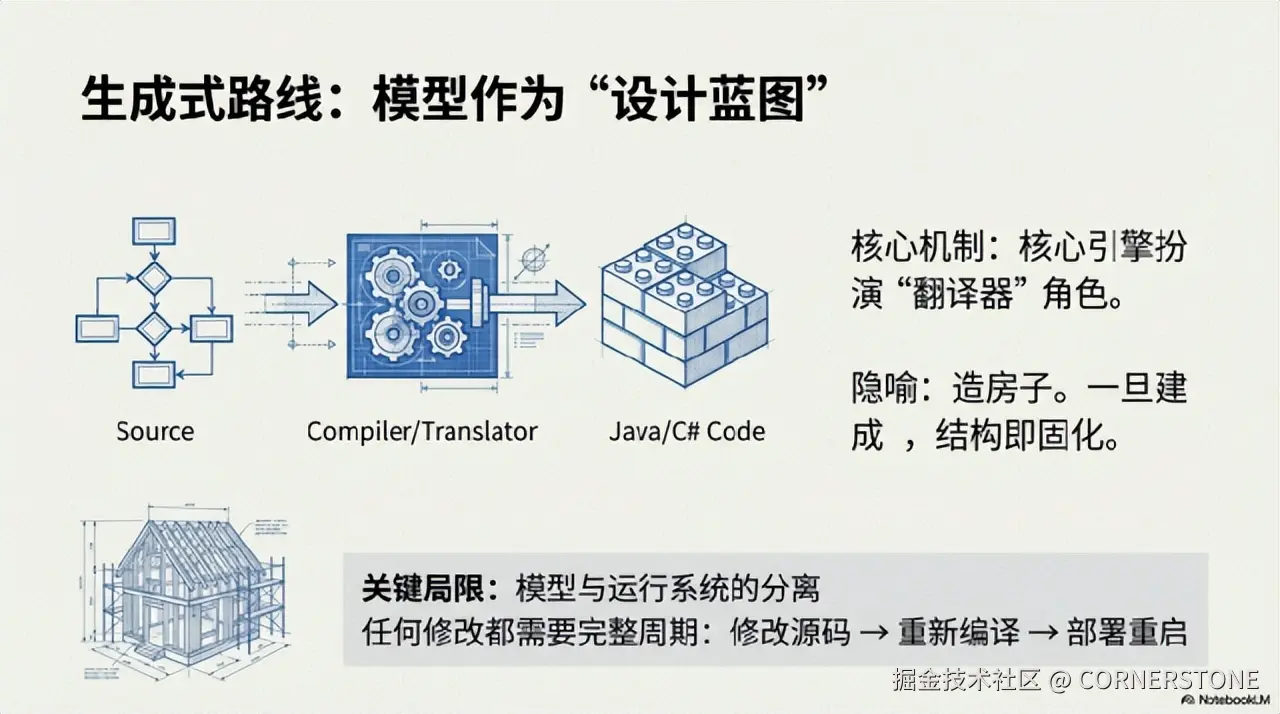·关键局限:“模型与运行系统的分离”。一旦代码生成并编译,业务逻辑便被固化;任何修改都必须走完“修改源码→重新编译→部署重启”的完整开发周期。
