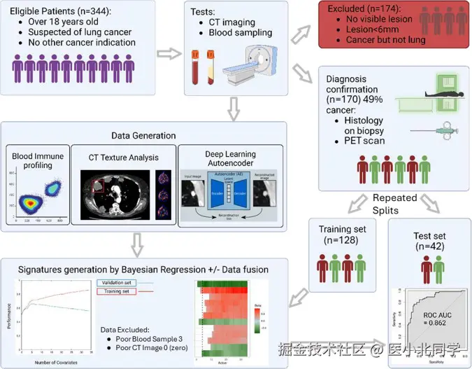 招募因疑似肺癌症状转诊至二级医疗机构的患者(N=344),排除病灶不可见或非肺癌病例后,最终纳入170例患者(肺癌组79例,非肺癌组91例)。同步采集患者的胸部CT影像及外周血样本。