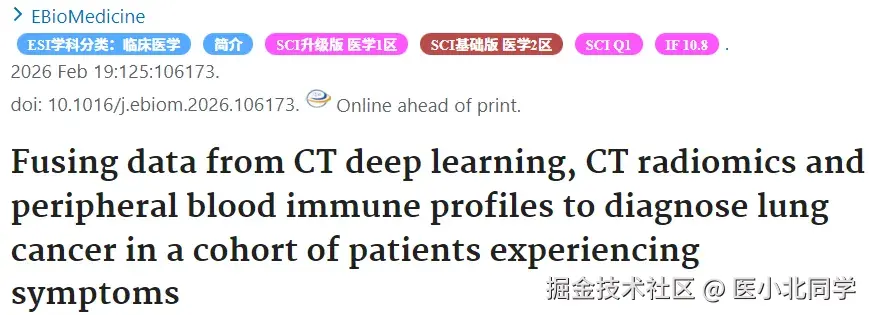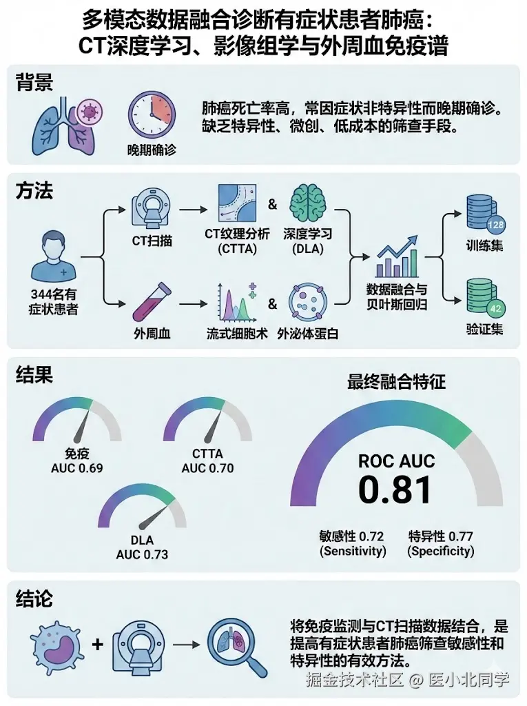 本研究首次证实,将CT深度学习特征与外周血特定免疫表型(特别是KIR3DL1+ CD8+ T细胞)相结合,能显著提升有症状患者的肺癌诊断效能。