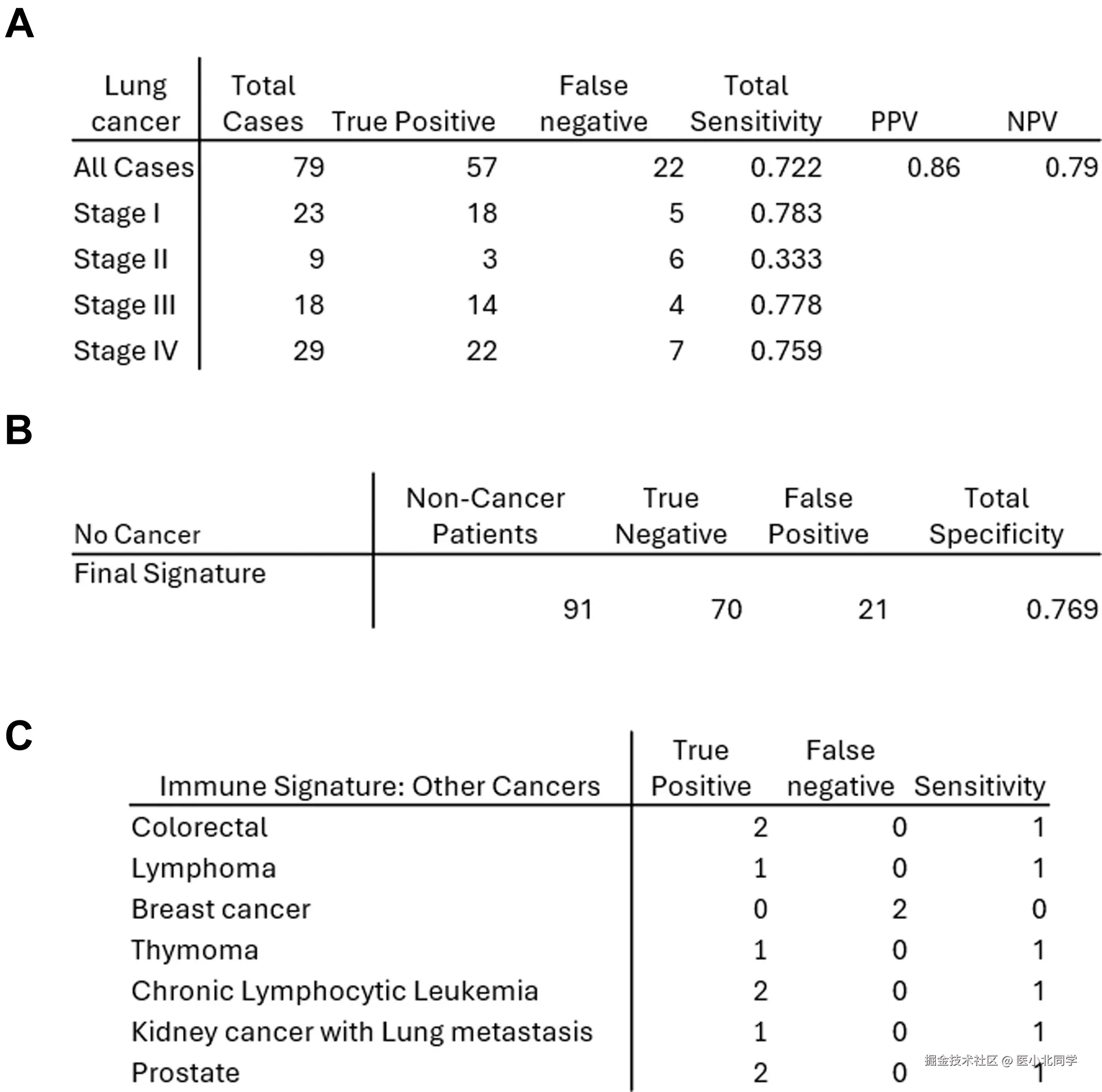 最终融合模型在全队列中的总体敏感度为72%,特异性为77%;在I期肺癌中敏感度仍维持在76-78%的高水平,表明该模型在有症状但处于疾病早期的患者中具有显著的临床应用潜力(Fig. 6)。