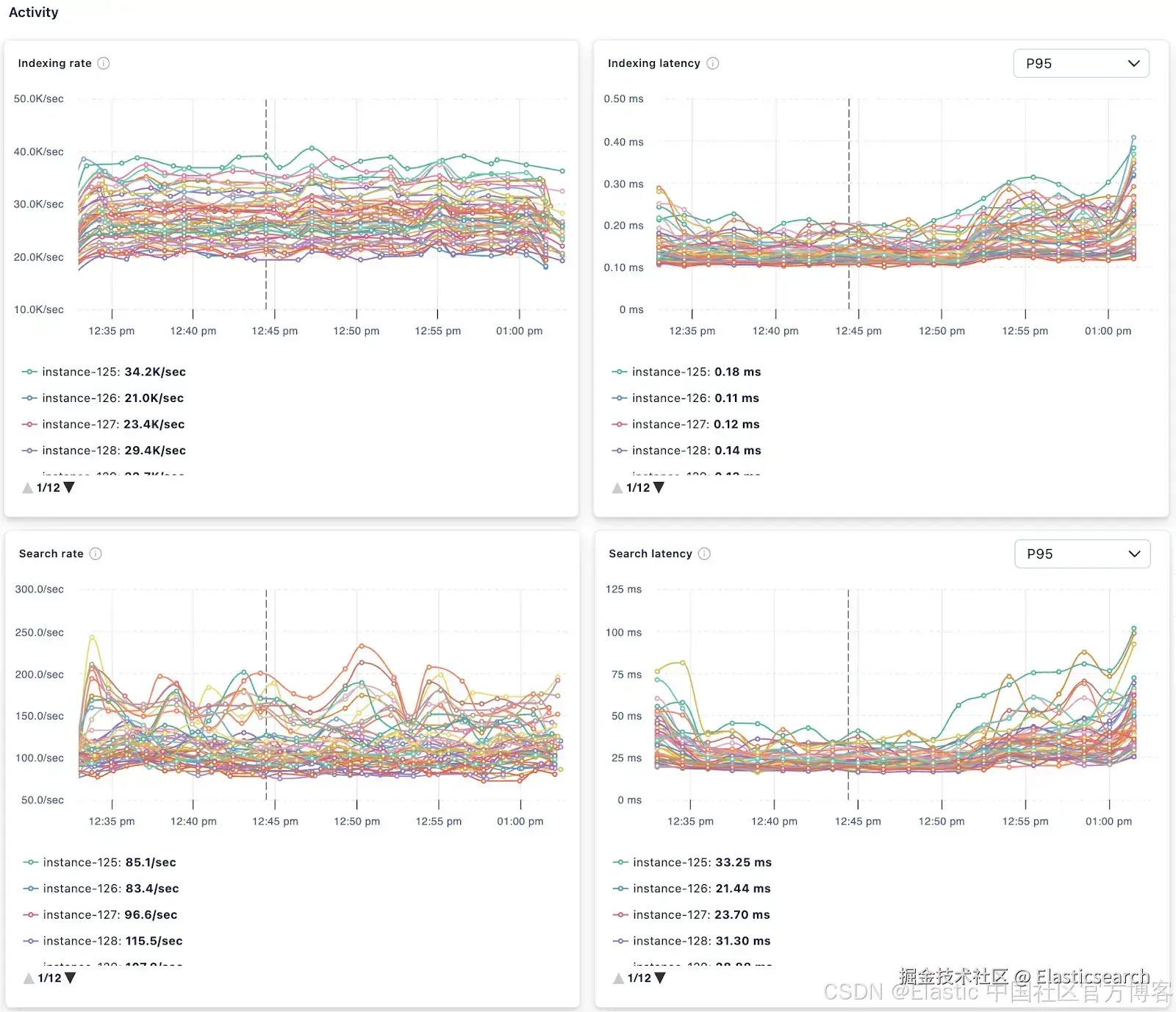 Nodes 视图允许你选择特定数据层的节点,并提供超过 50 种指标可视化,其中包括搜索和索引性能。这些可视化能直观地帮助你理解各个节点之间的性能差异,以及是否存在需要关注的“吃力”节点。如下图所示,我们可以看到有些节点的索引速率是其他节点的两倍,而搜索延迟则累积到最快节点的四倍。