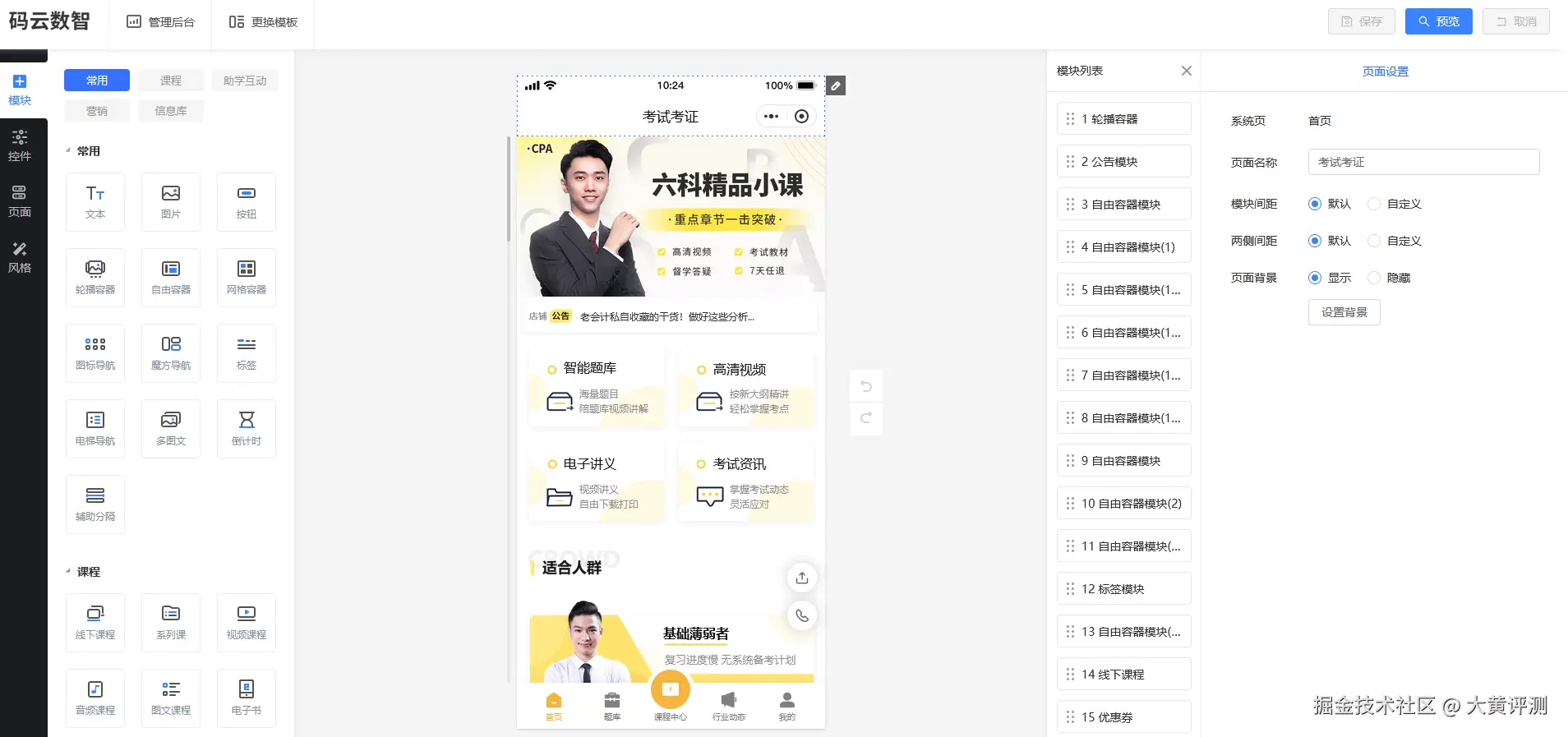 模块调整:将轮播图(展示热门课程)、课程列表、分类导航、讲师展示等模块拖至合适位置。