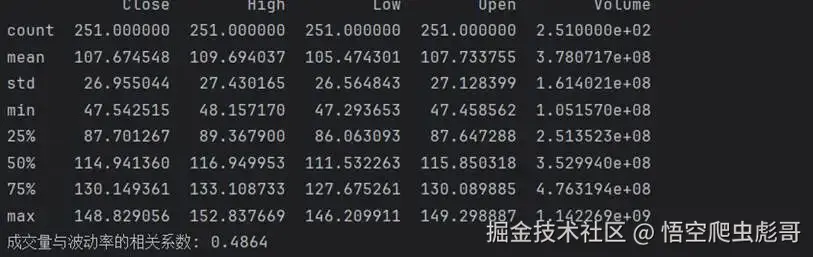 分析目的:分析成交量这一交易活跃度指标,是否与股价日内波动率存在相关关系,以判断成交量变化对价格波动的影响程度。分析方法:首先计算日内波动率指标,公式是日内波动率 = (最高价 - 最低价) / 最低价,随后利用 Pandas 计算成交量与波动率之间的相关系数,并通过 Matplotlib 绘制散点图进行可视化分析。结果展示:(图表2:成交量与日内波动率散点图)计算结果:成交量与波动率的相关系数为 0.4864。