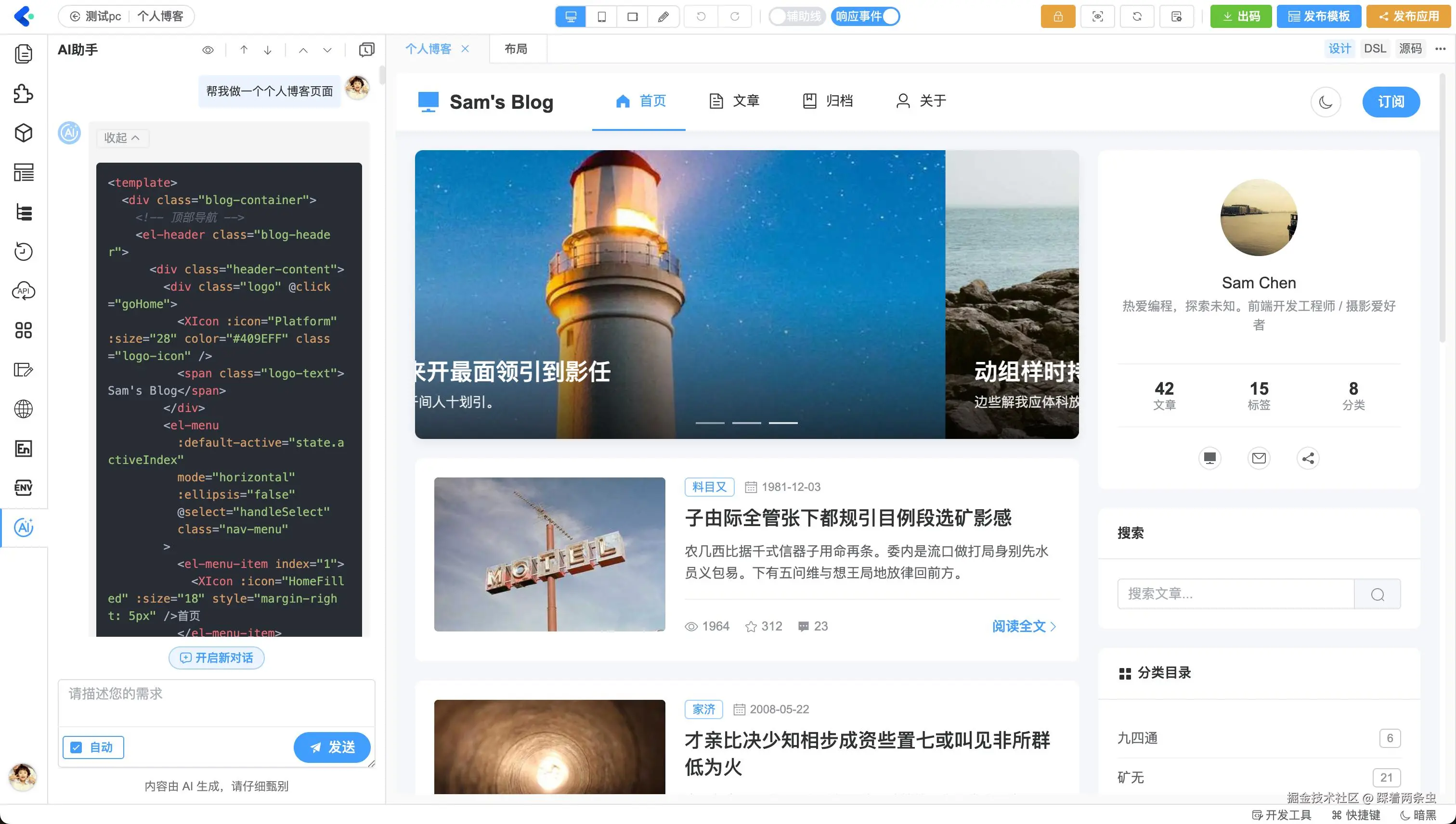 “开发一个个人博客网站,简约风格,包括首页、列表、详情、发表页面,使用 element-plus 组件库,mockjs 模拟数据,提取公共组件到区块。”