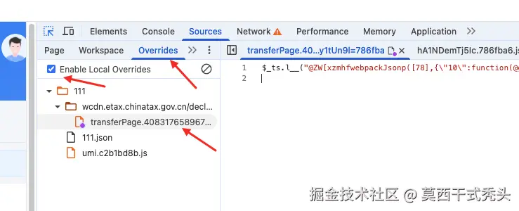 1、先把当前页面的 js 文件 transferPage添加到 Override content 里面