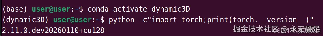 然后通过激活环境命令进入对应的虚拟环境进行查看,图中括号内显示的就是当前处于哪个环境中。执行查看版本的代码后显示的就是2.11的PyTorch和12.8的CUDA Runtime。