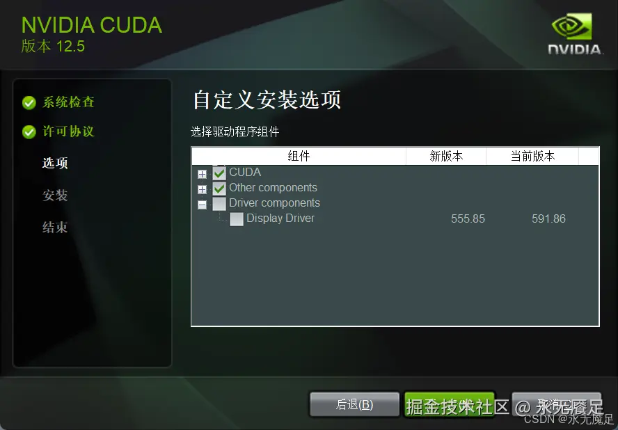 取消安装驱动的选项(注意图中新版本和当前版本号,如果选择安装驱动,反而会使得驱动版本降级):