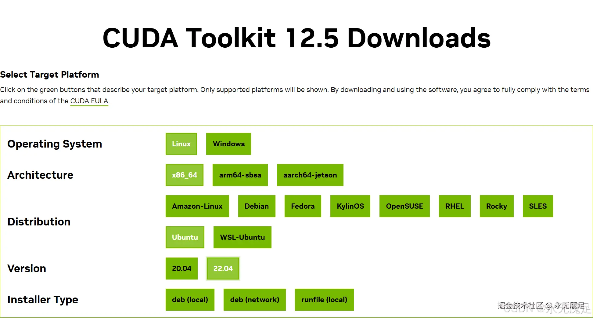 Linux操作系统同样,但是需要注意下的是哪个发行商哪个版本的,比如下面选择的是乌班图,可以看到CUDA12.5支持的是20.04和22.04版本的乌班图,如果是其他版本就要找其对应的CUDA。