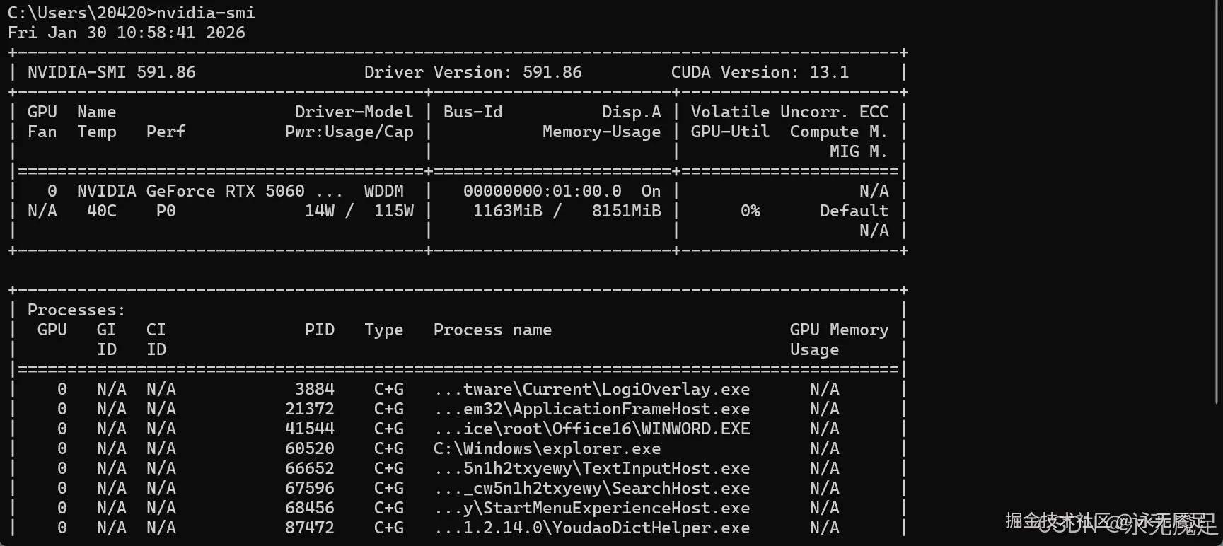 首先查看GPU版本,在命令行窗口输入nvidia-smi,查看电脑的GPU版本,图中的Driver Version就是驱动版本号,CUDA Version是当前显卡最高可支持的CUDA版本。