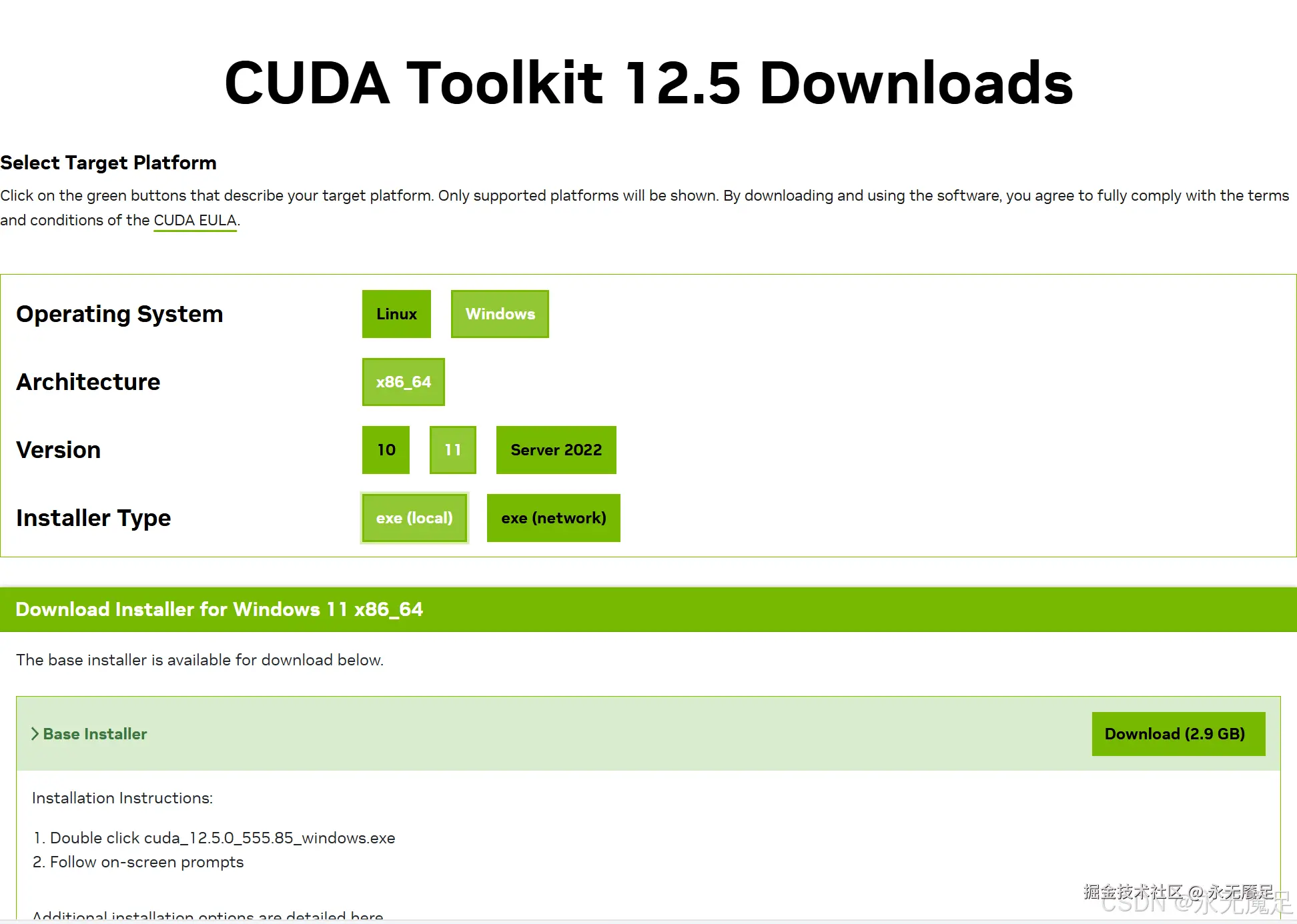 这里安装的是CUDA Tooklit;事实上,PyTorch兼容的是CUDA Runtime。前者是完整的开发工具包,后者是运行CUDA所需最小库的集合。如果只使用PyTorch进行深度学习,而不是开发CUDA C++扩展,就不需要安装CUDA Tooklit。