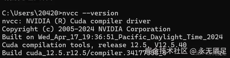 最后安装成功后,在终端命令窗口输入 nvcc --version 查看,显示以下内容即安装成功 :