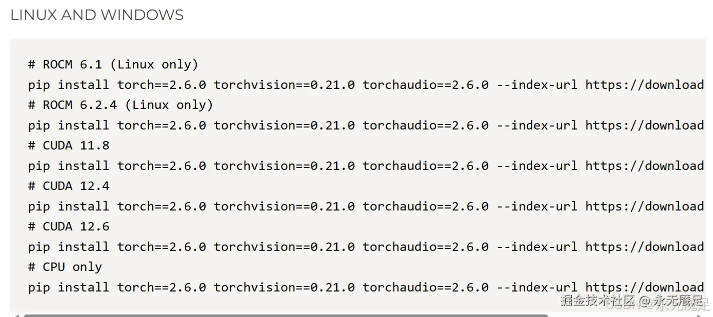 这里只需要注意两点问题:1.就是前面提到的PyTorch有CPU和GPU版本之分。2.就是选择PyTorch要看驱动程序版本。因为驱动程序是向后兼容CUDA Runtime的。如下图,假如驱动最高支持CUDA 12.5,那么就可以装图中的CUDA12.4或者11.8对应的PyTorch,CUDA12.6的不行,最后一行是CPU版本的: